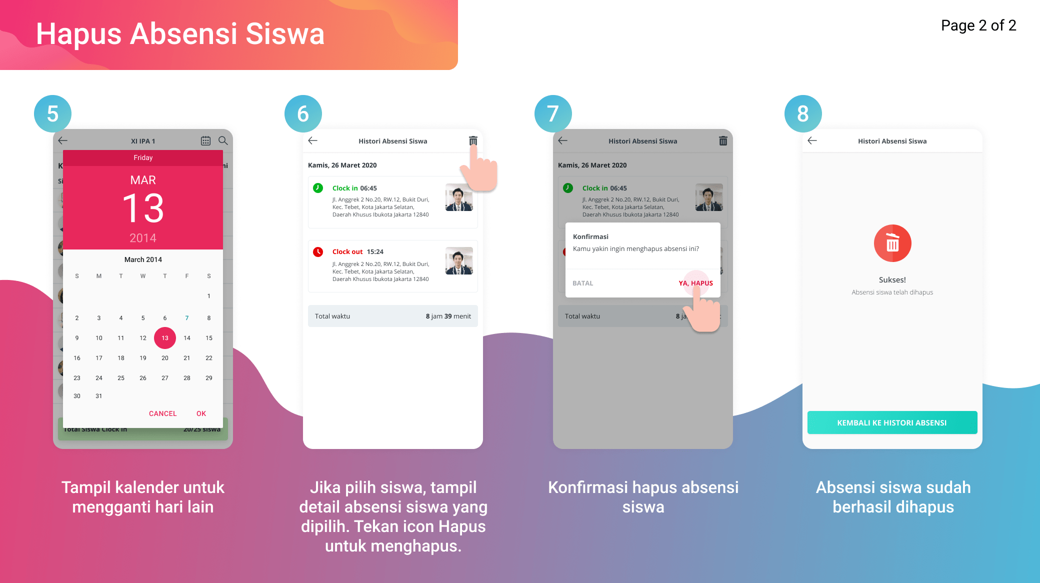 Pada saat kamu mengecek data absensi siswa, kamu dapat menghapus data absensi siswa jika tidak valid. Untuk menghapus absensi siswa, kamu dapat melakukannya pada saat melihat data absen siswa. Siswa yang datanya dihapus akan mendapat notifikasi.