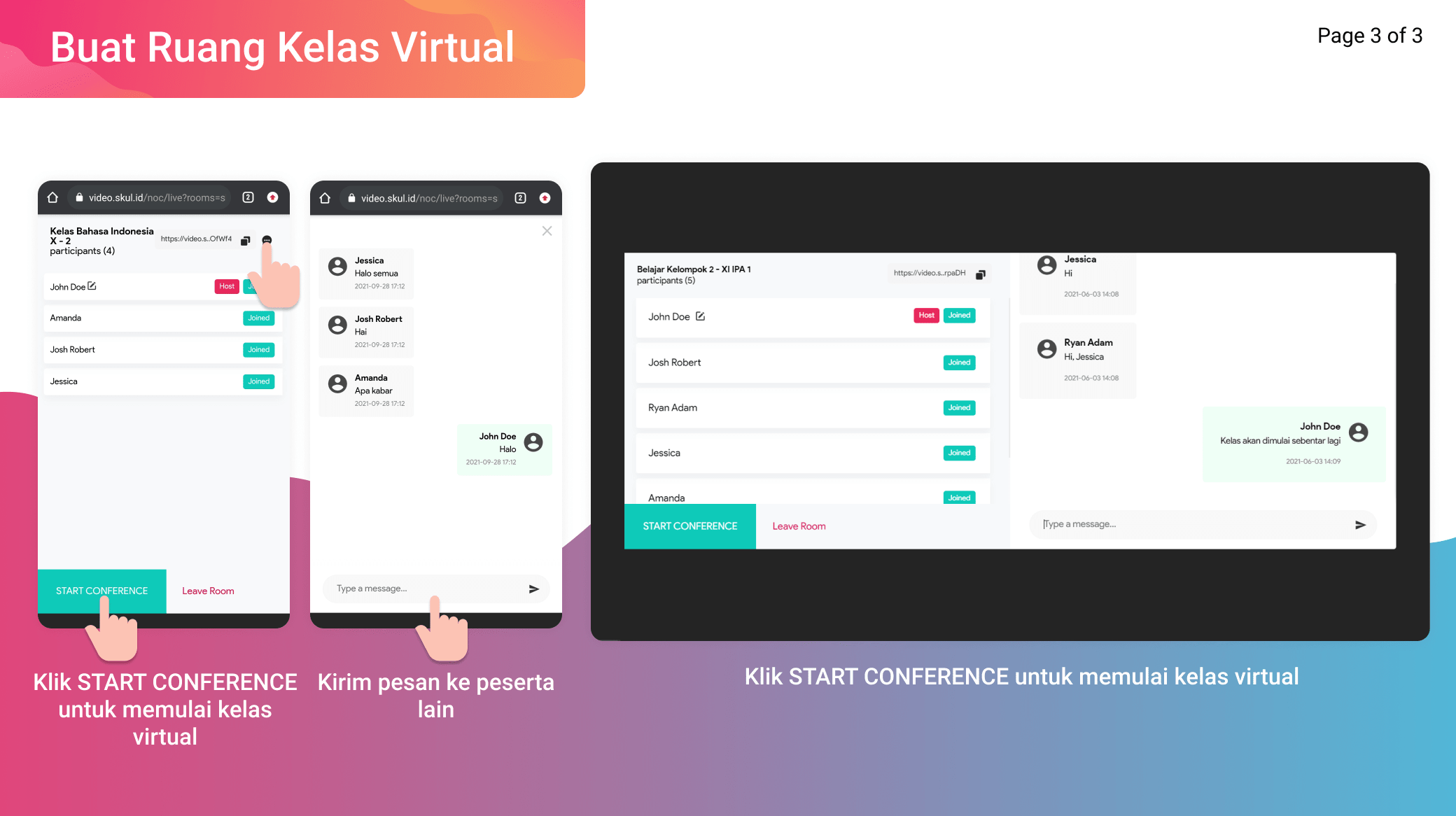 Info: Pastikan seluruh peserta atau minimal 2 peserta sudah tergabung dalam waiting room lalu siswa sebagai host klik START CONFERENCE untuk memulai kelas.