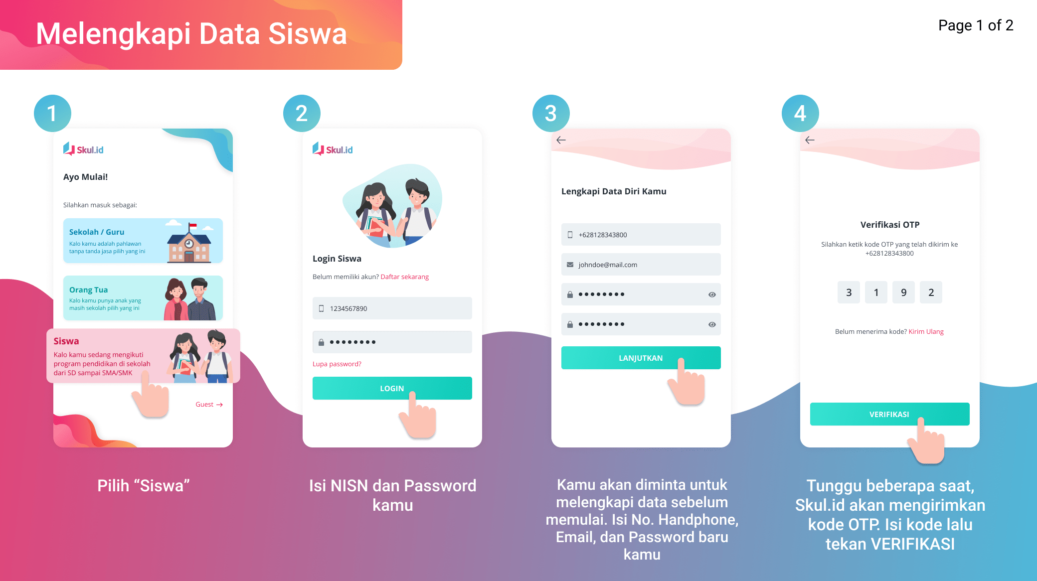 Jika kamu adalah siswa yang sudah didaftarkan oleh sekolah, sebelum menggunakan fitur pada Skul.id kamu harus melengkapi data kamu terlebih dahulu diantaranya no. handphone, email, dan password. Pastikan nomor handphone yang akan kamu daftarkan aktif karena Skul.id akan mengirim kode OTP untuk verifikasi.