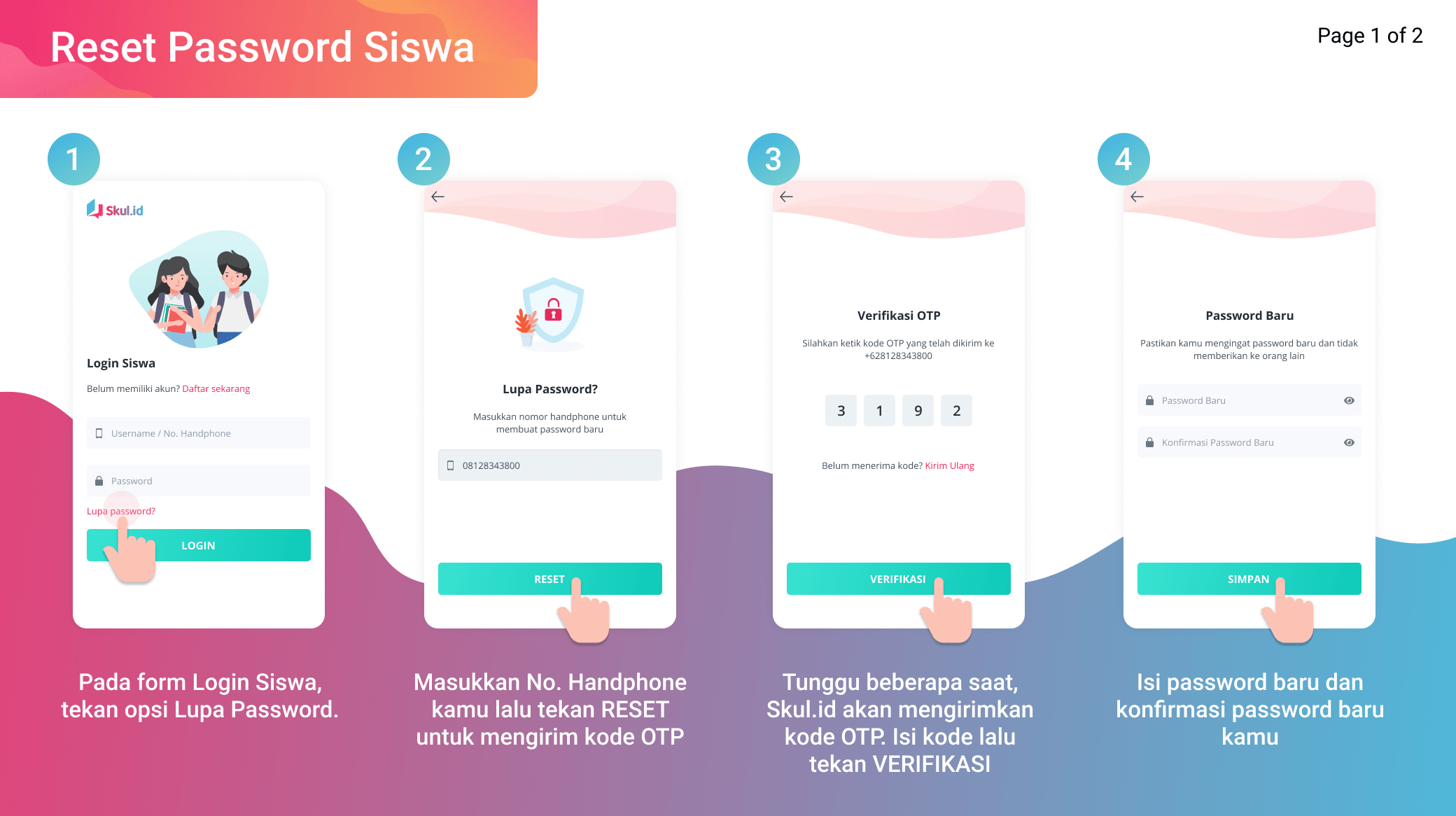 Jika kamu ingin masuk aplikasi namun kamu lupa password yang sudah kamu buat, kamu dapat mereset password. Pastikan nomor handphone yang kamu daftarkan aktif karena Skul.id akan mengirim kode OTP untuk verifikasi.