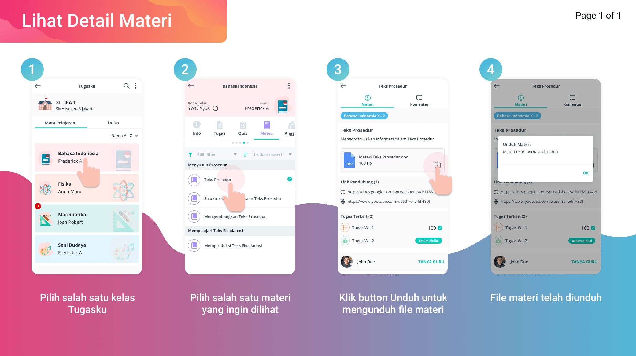 Siswa dapat melihat informasi lengkap mengenai materi di dalam kelas Tugasku melalui halaman detail materi. Siswa juga dapat mengunduh file materi tersebut. Selain itu, juga dapat melihat komentar pada materi tersebut.