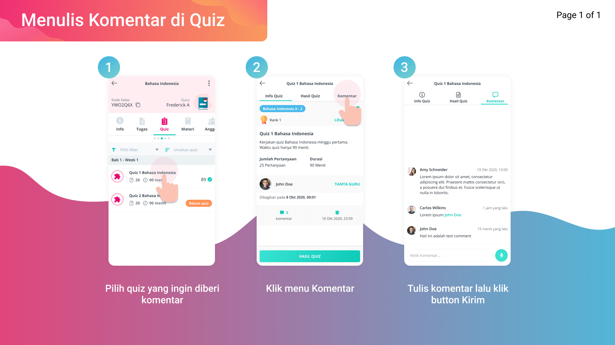 Guru dan siswa dapat menulis komentar pada quiz di kelas. Seluruh anggota kelas dapat melihat dan ikut menulis komentar.