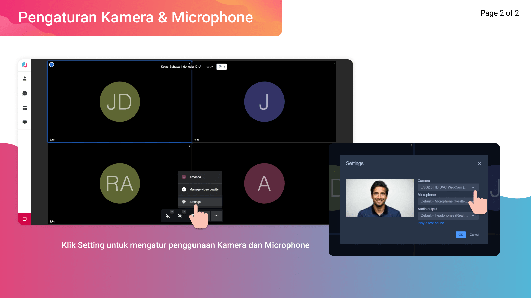 Untuk mengubah pengaturan microphone dan audio output, siswa dapat mengklik icon more, lalu pilih Setting. Siswa dapat menentukan penggunaan perangkat microphone dan kamera pada halaman tersebut.