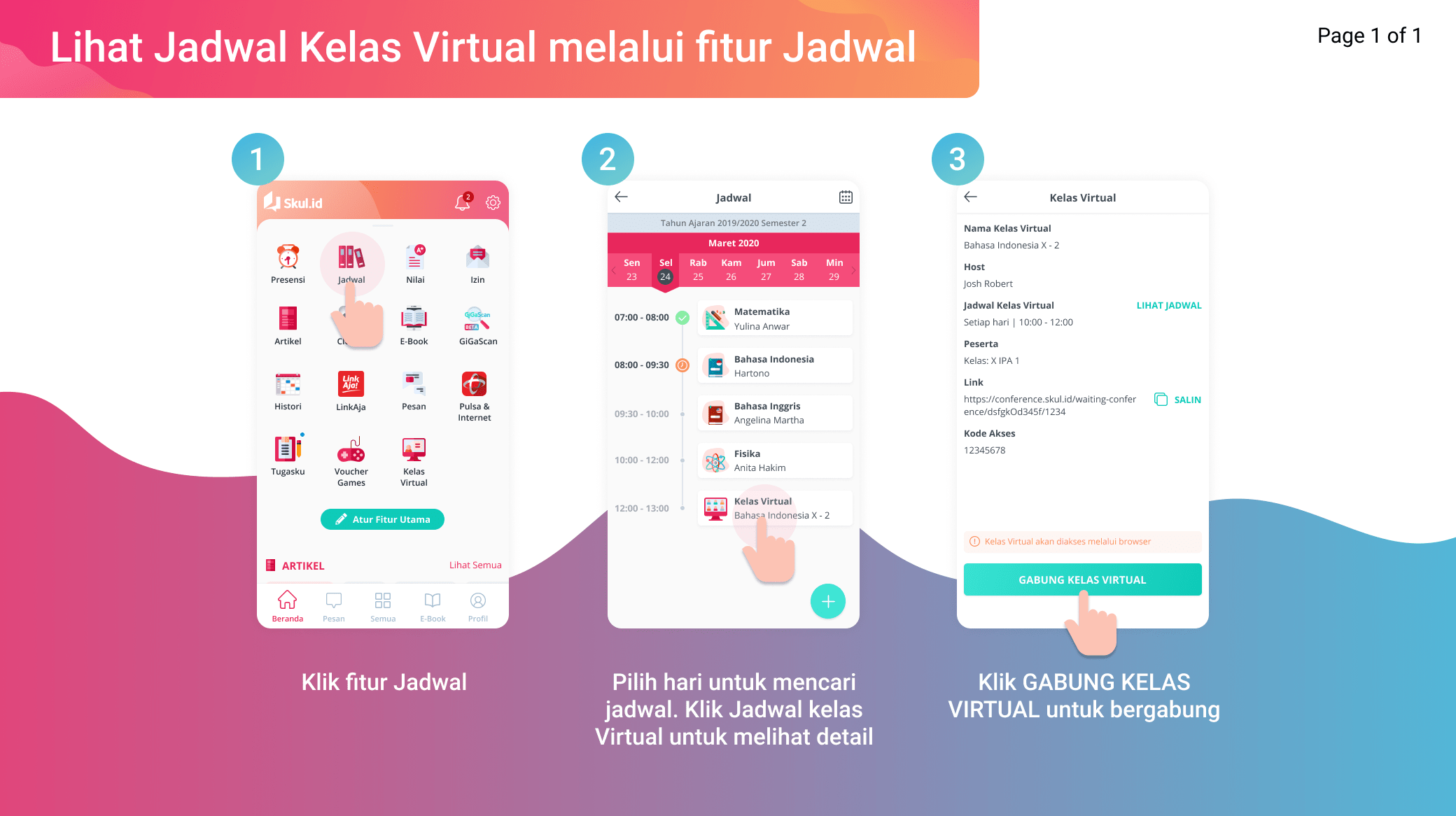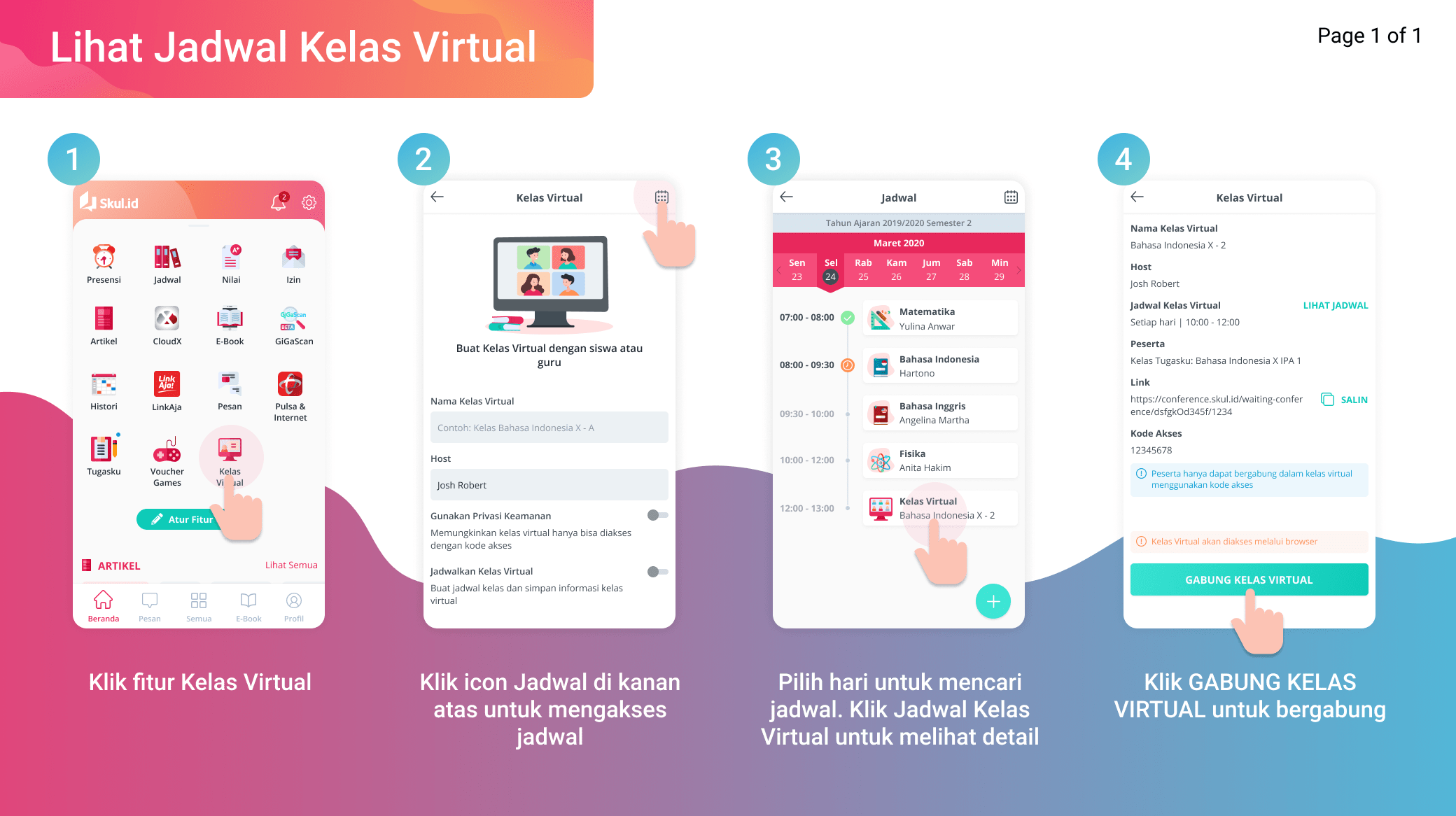 Untuk melihat jadwal kelas virtual yang sudah dibuat oleh guru, siswa dapat mengaksesnya melalui fitur kelas virtual atau juga dapat melalui fitur jadwal.