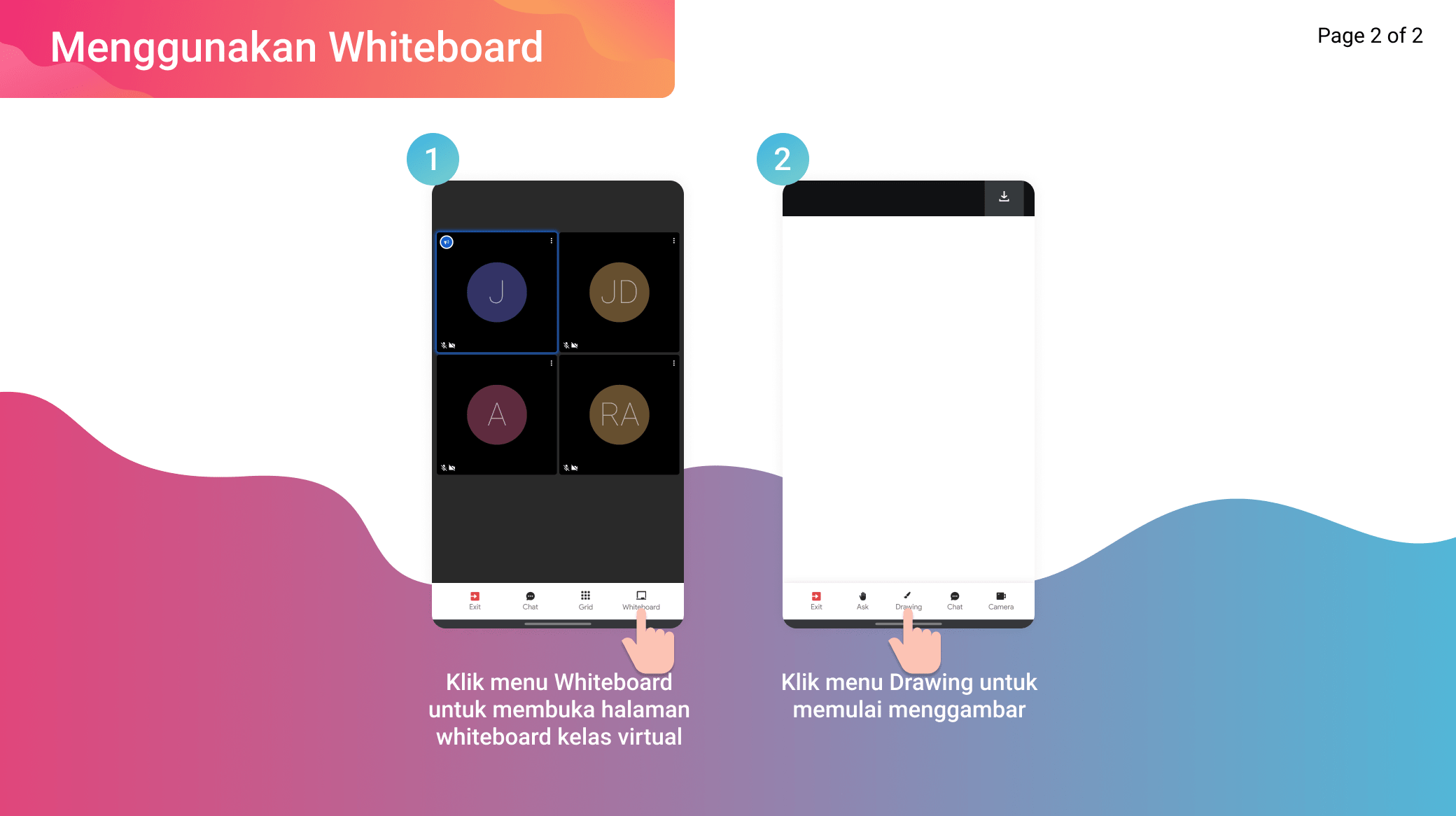 Untuk menggambar pada whiteboard, siswa dapat mengklik icon Whiteboard di sebelah kiri jika menggunakan laptop atau PC, atau klik icon Whiteboard di bagian bawah jika menggunakan handphone.