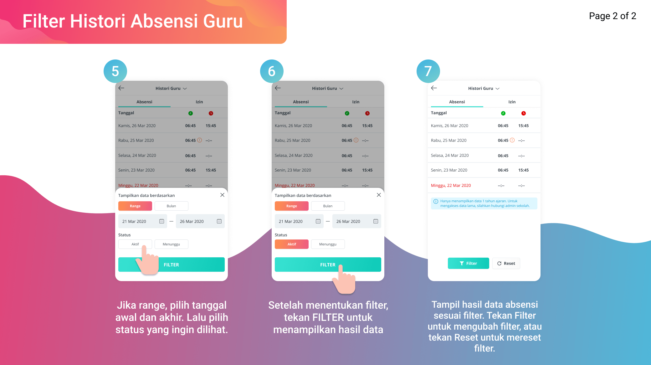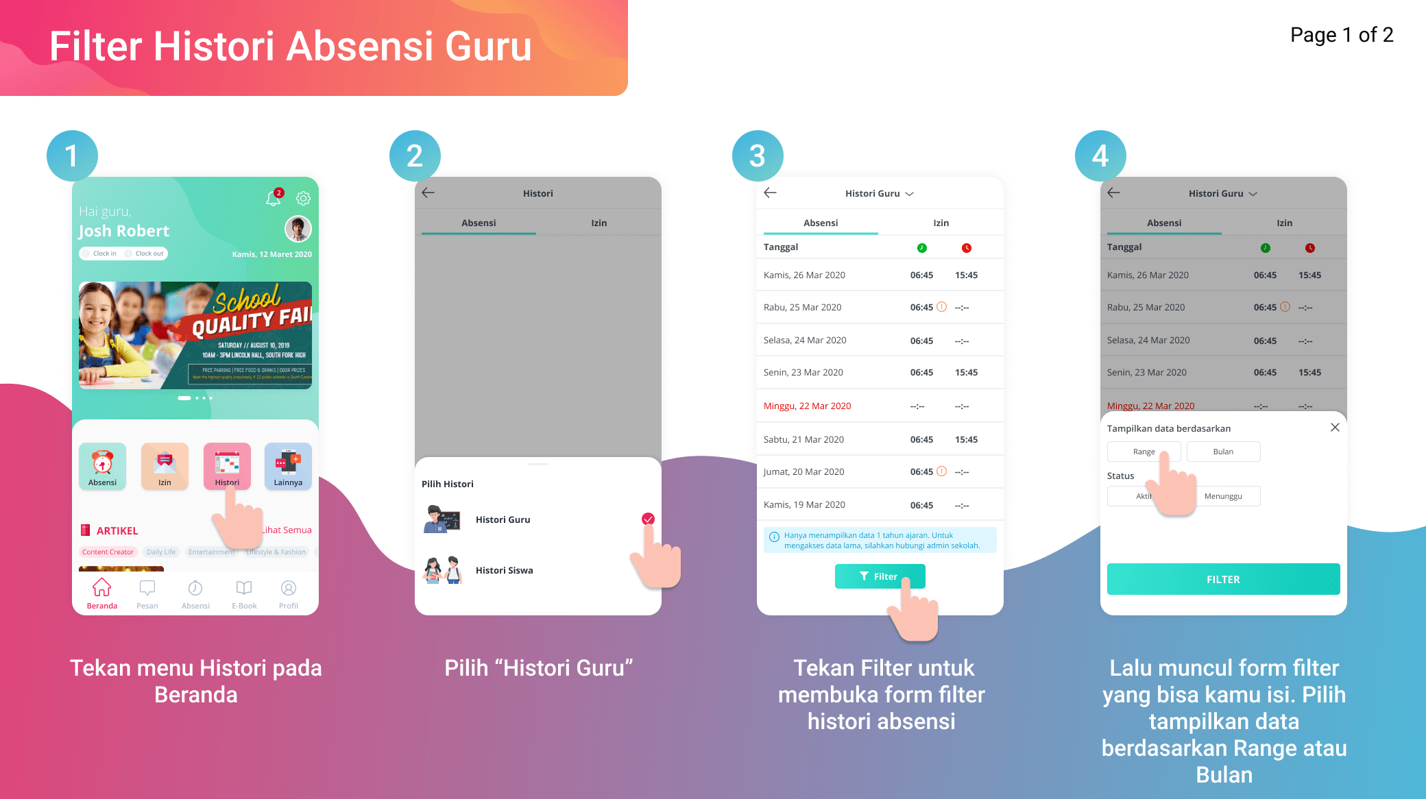 Berikut merupakan tahapan untuk filter histori absensi guru.