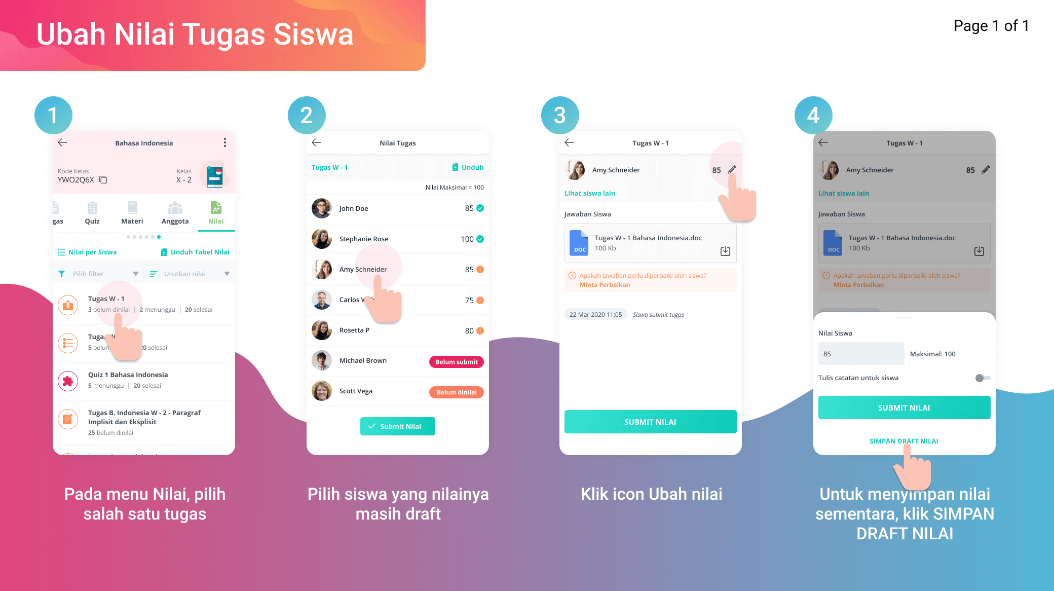 Guru dapat mengubah nilai tugas siswa yang nilainya masih draft. Selama nilai siswa masih draft, siswa belum dapat melihat nilainya.