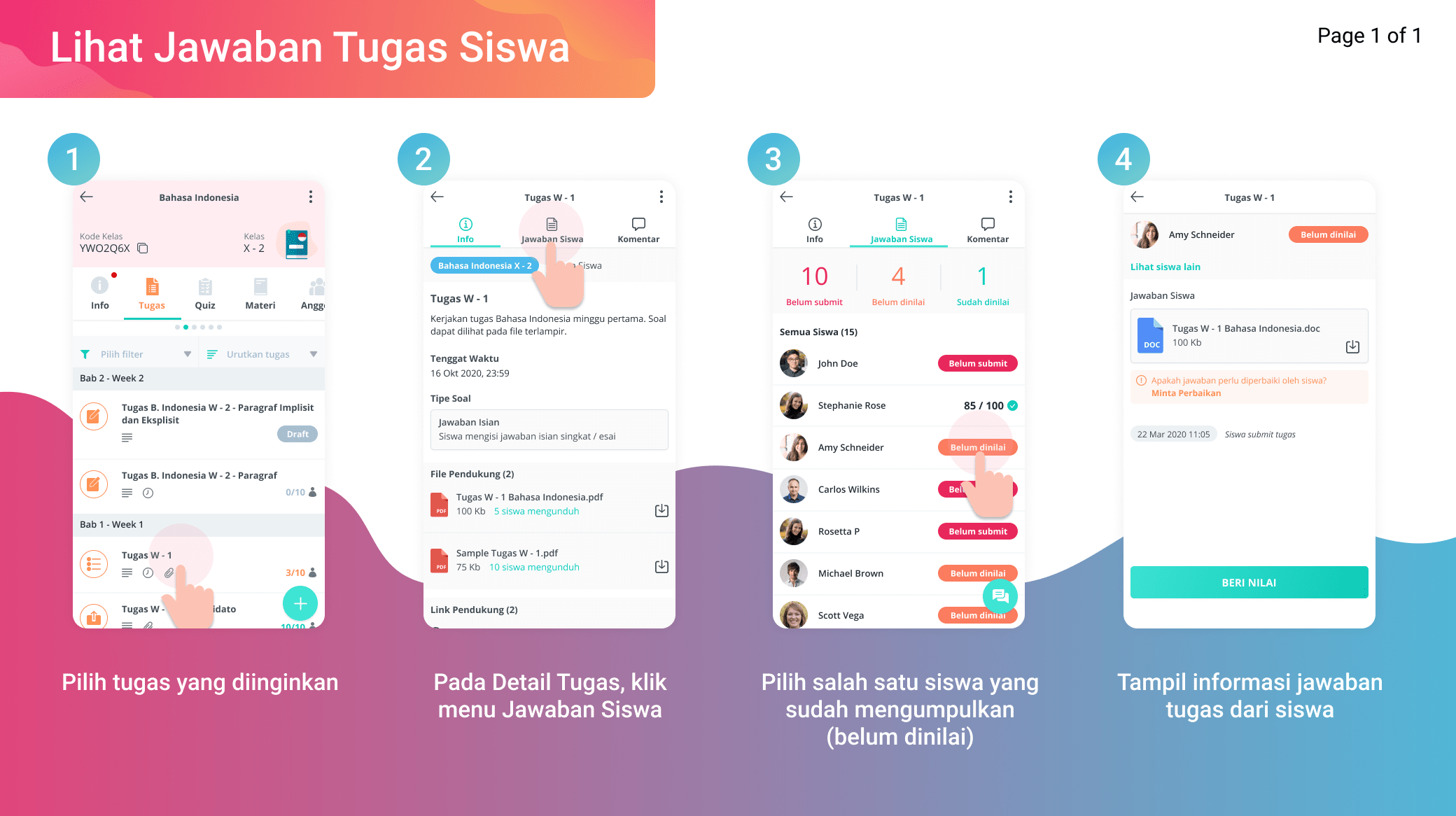 Guru dapat melihat siapa saja siswa yang sudah mensubmit jawaban tugas. Selain itu guru juga dapat melihat list siswa yang belum submit, dan yang sudah dinilai.