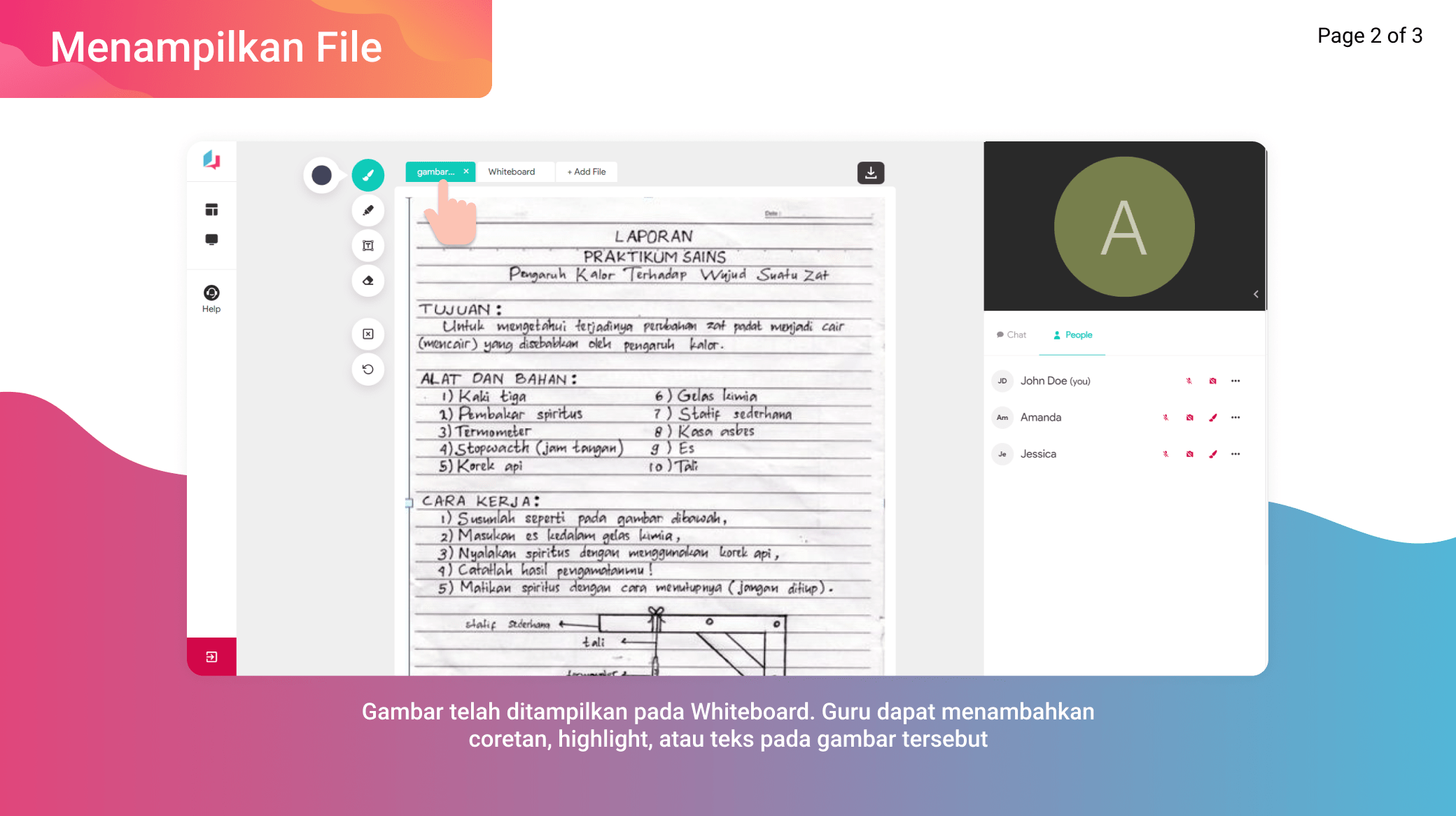 Siswa dan guru lain dapat melihat file yang dibagikan oleh host. Berikut merupakan tampilan file pada whiteboard di layar peserta lain yang menggunakan handphone dan laptop atau PC.