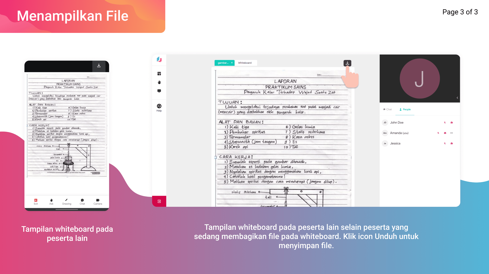 Info: Siswa dan guru dapat menyimpan file dengan cara klik icon Unduh di kanan atas whiteboard.