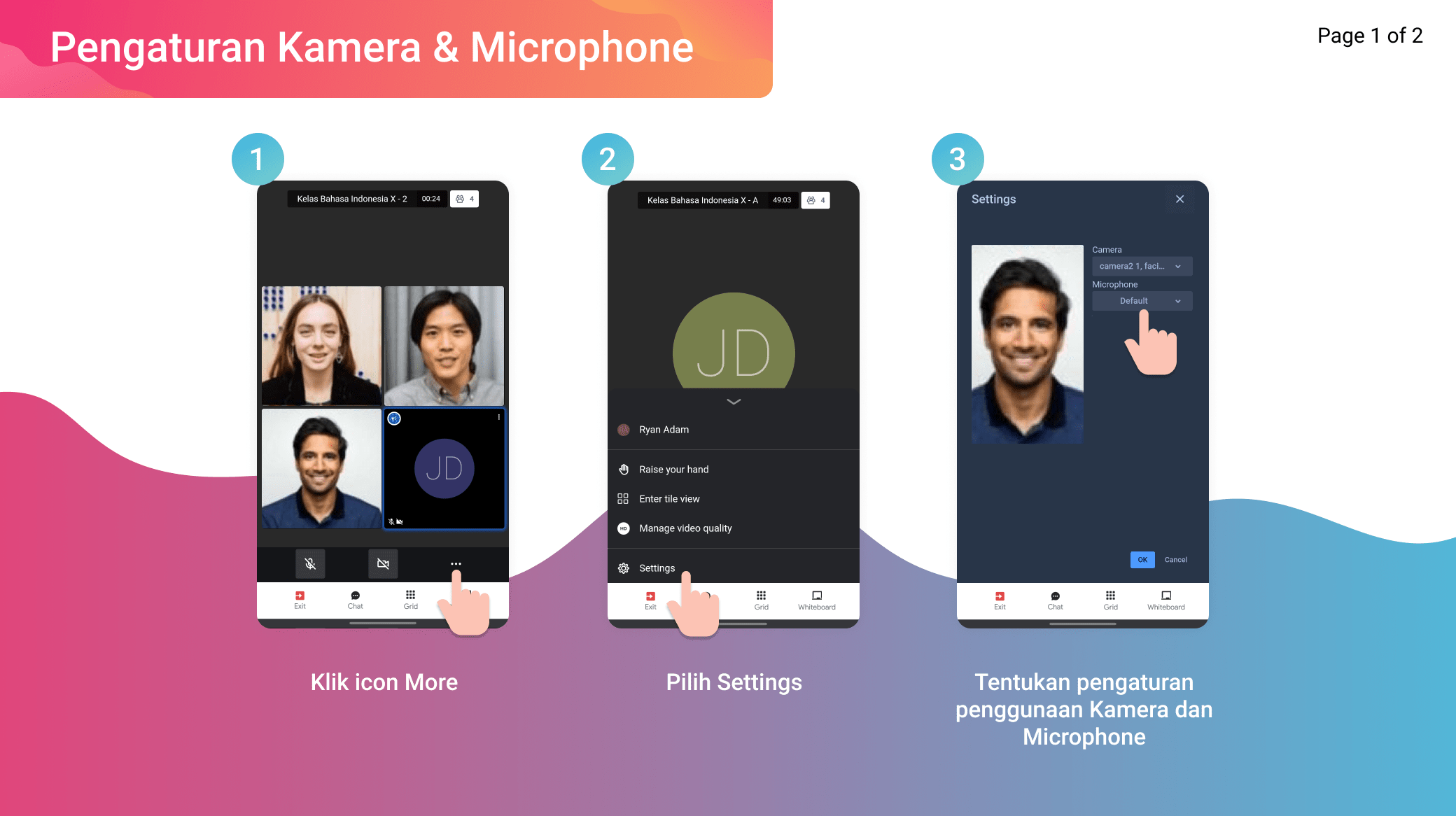 Untuk mengubah pengaturan microphone dan audio output, guru dapat mengklik icon more, lalu pilih Setting. Guru dapat menentukan penggunaan perangkat microphone dan kamera pada halaman tersebut.