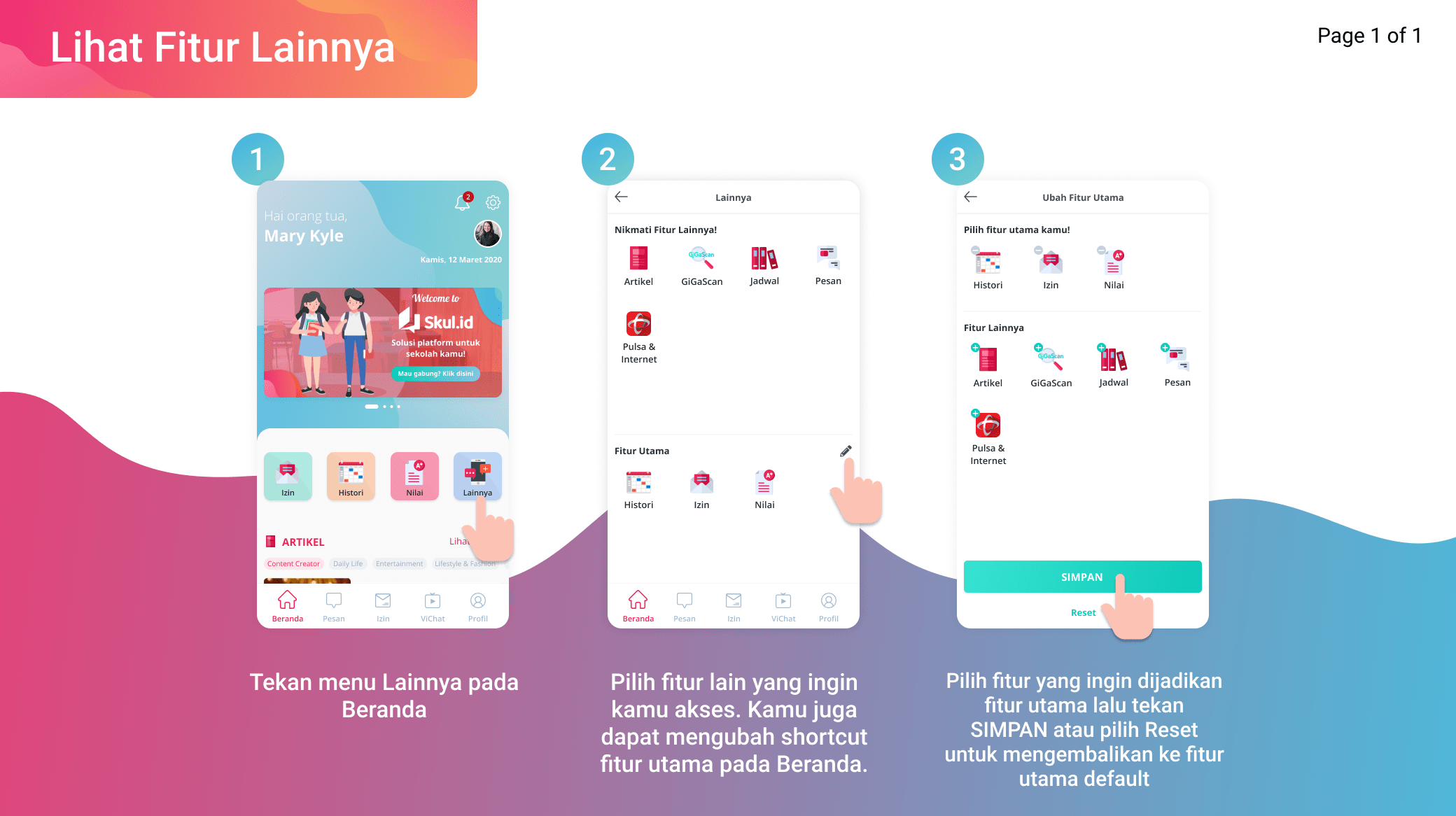 Selain fitur-fitur utama yang tampil pada Beranda, kamu dapat mengakses fitur lainnya melalui menu Lainnya. Selain itu kamu juga dapat mengubah fitur utama yang ingin tampil pada halaman Beranda.