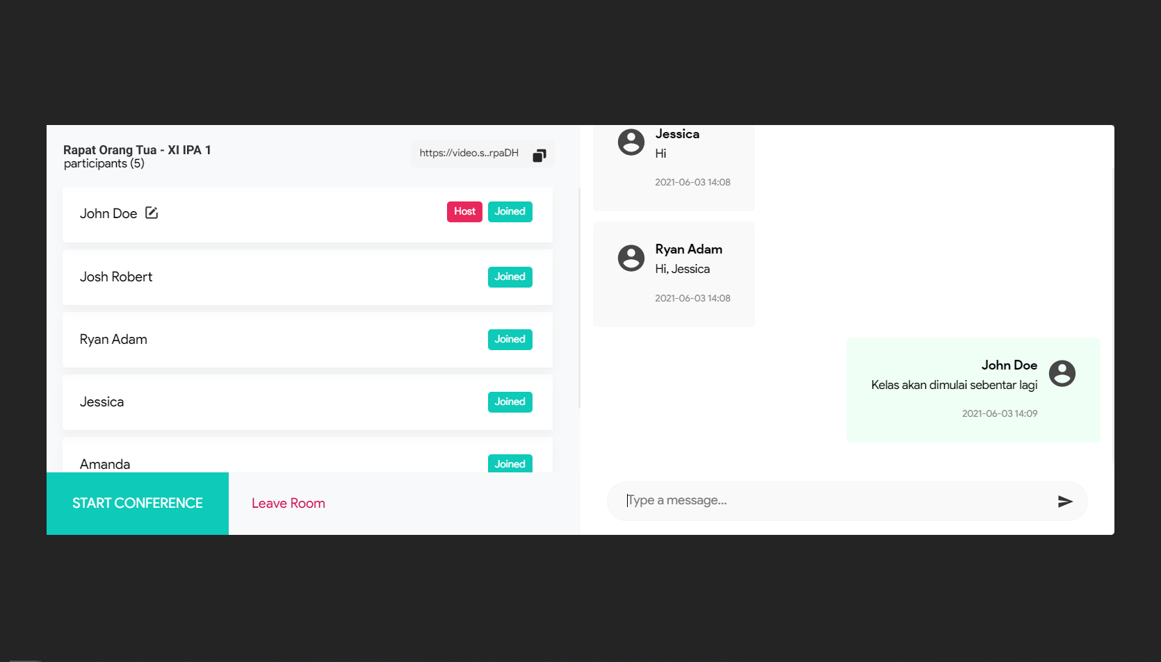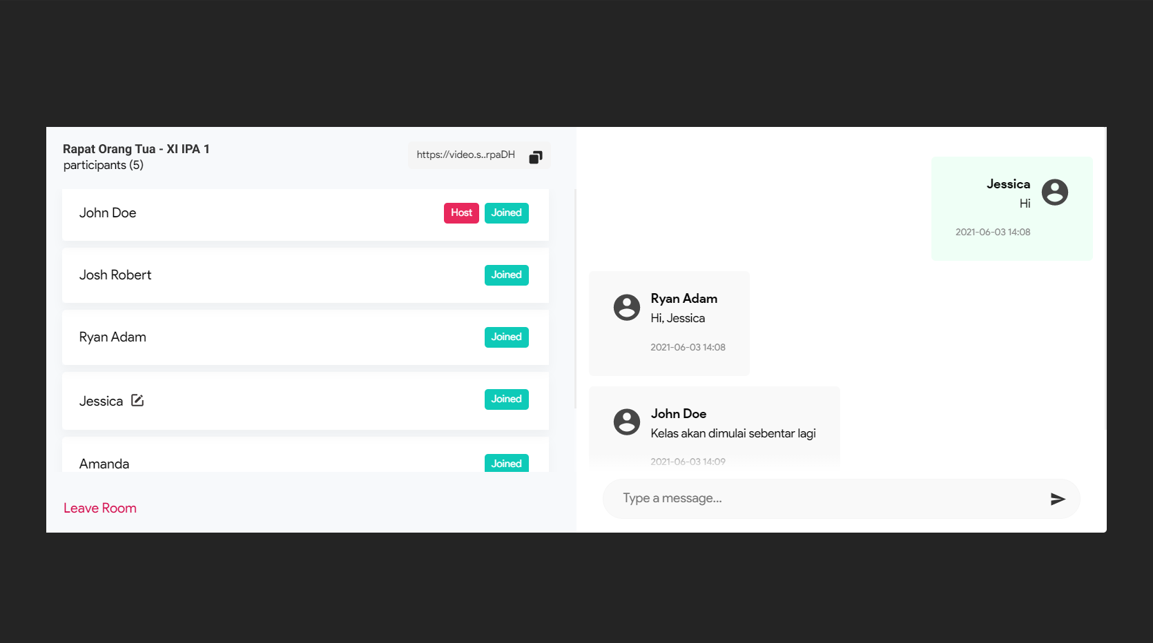 Selanjutnya orang tua akan dibawa ke halaman Waiting Room. Di sini, orang tua dapat melihat partisipan lain yang sudah bergabung. Orang tua juga bisa mengirim pesan ke forum.