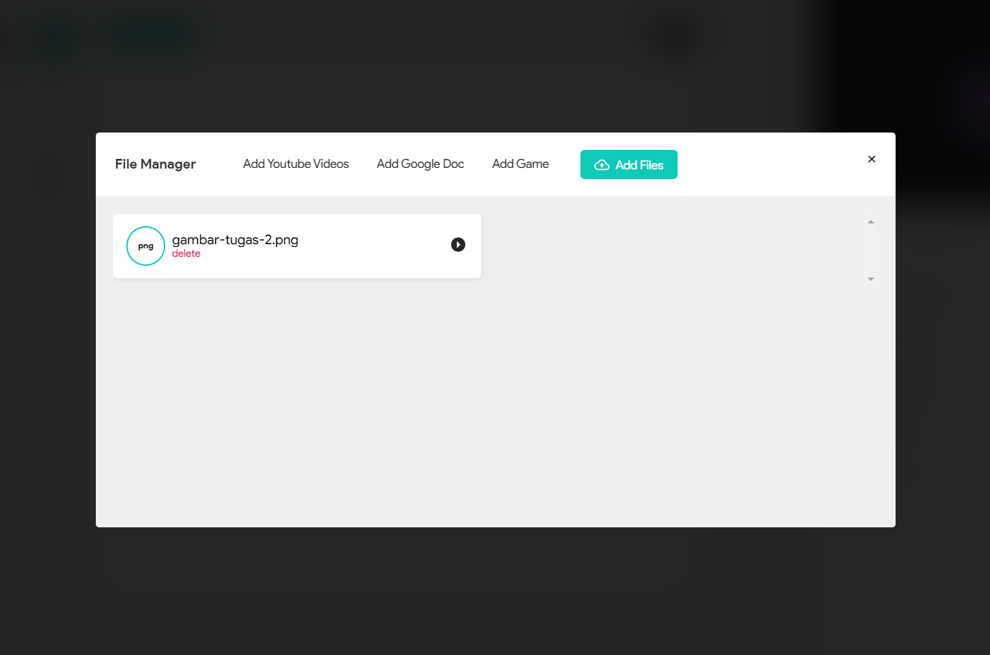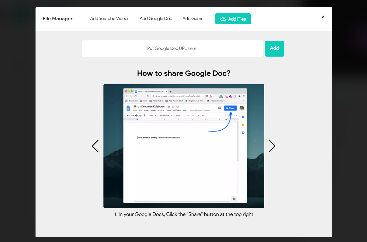 Host dapat membagikan file pada kelas virtual. Terdapat beberapa cara untuk membagikan file, diantaranya mengambil file dari device host, google docs, dan Youtube.