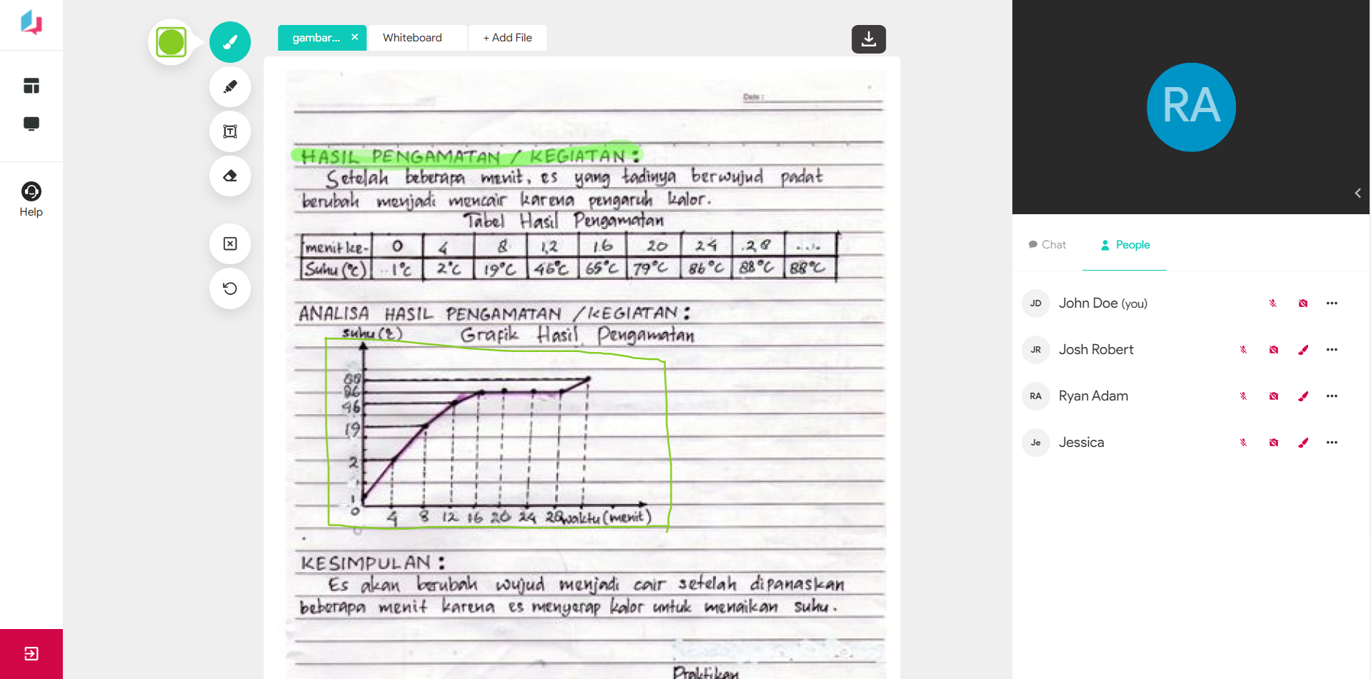 Host dapat memberi akses anggota kelas virtual untuk menggambar pada whiteboard. Pada menu People, klik icon Whiteboard pada list nama anggota yang ingin diberi akses.