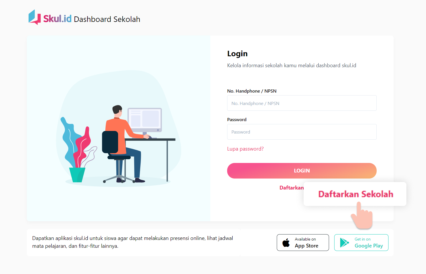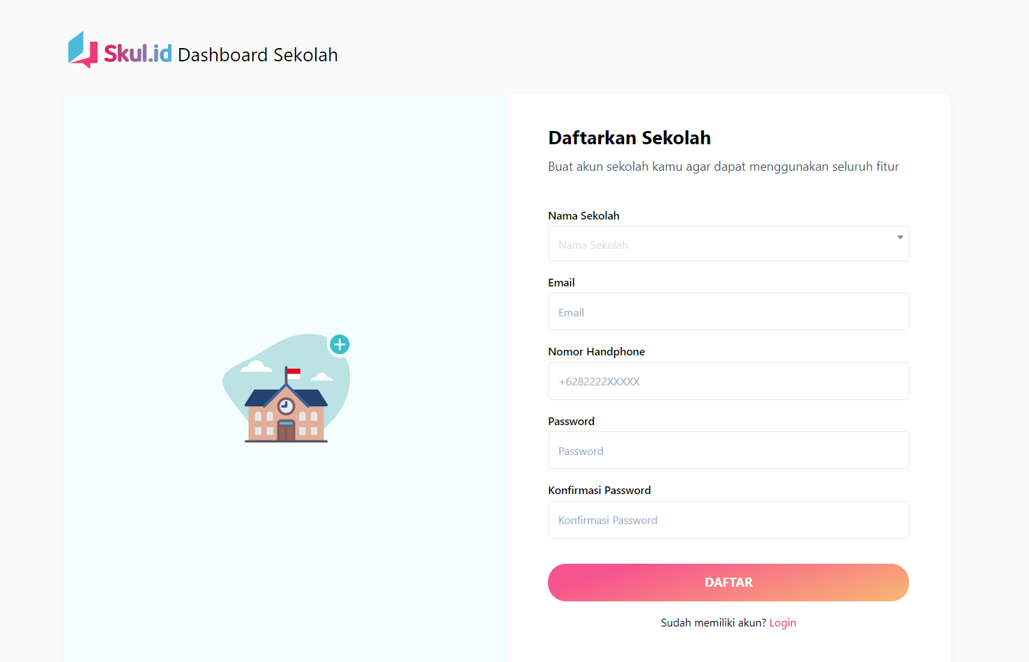 Untuk mendaftarkan sekolah Anda dalam aplikasi skul.id, kunjungi https://dashboard.skul.id lalu klik pada link bertuliskan "Daftarkan sekolah"