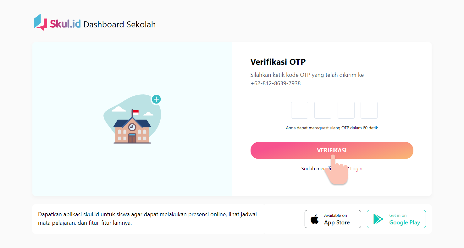 Harap masukan nomor handphone yang aktif karena nantinya nomor ini akan digunakan untuk login ke dalam dashboard sekolah Anda.