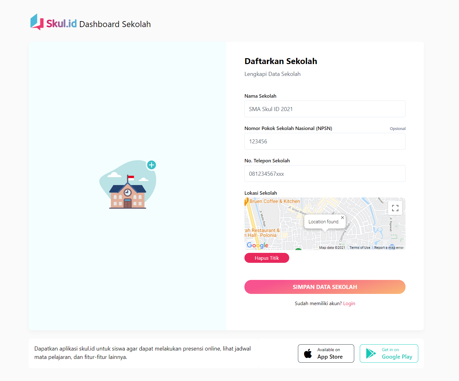 Anda dapat menggunakan peta yang tersedia untuk menunjuk pada lokasi sekolah Anda.