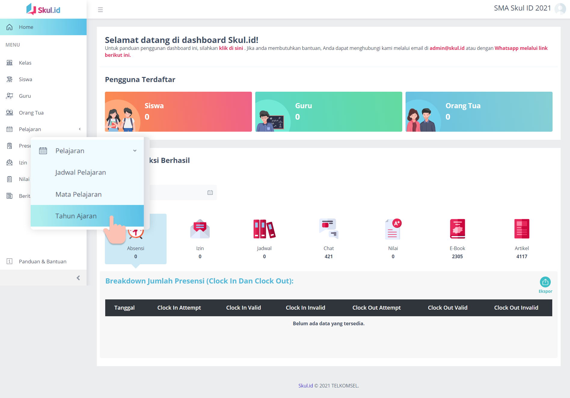 Langkah selanjutnya adalah melengkapi data tahun ajaran. Hal ini diperlukan sebelum memulai fitur yang lain karena akan menentukan periode semester ganjil dan semester genap. Klik Menu Pelajaran lalu Sub Menu Tahun Ajaran.
