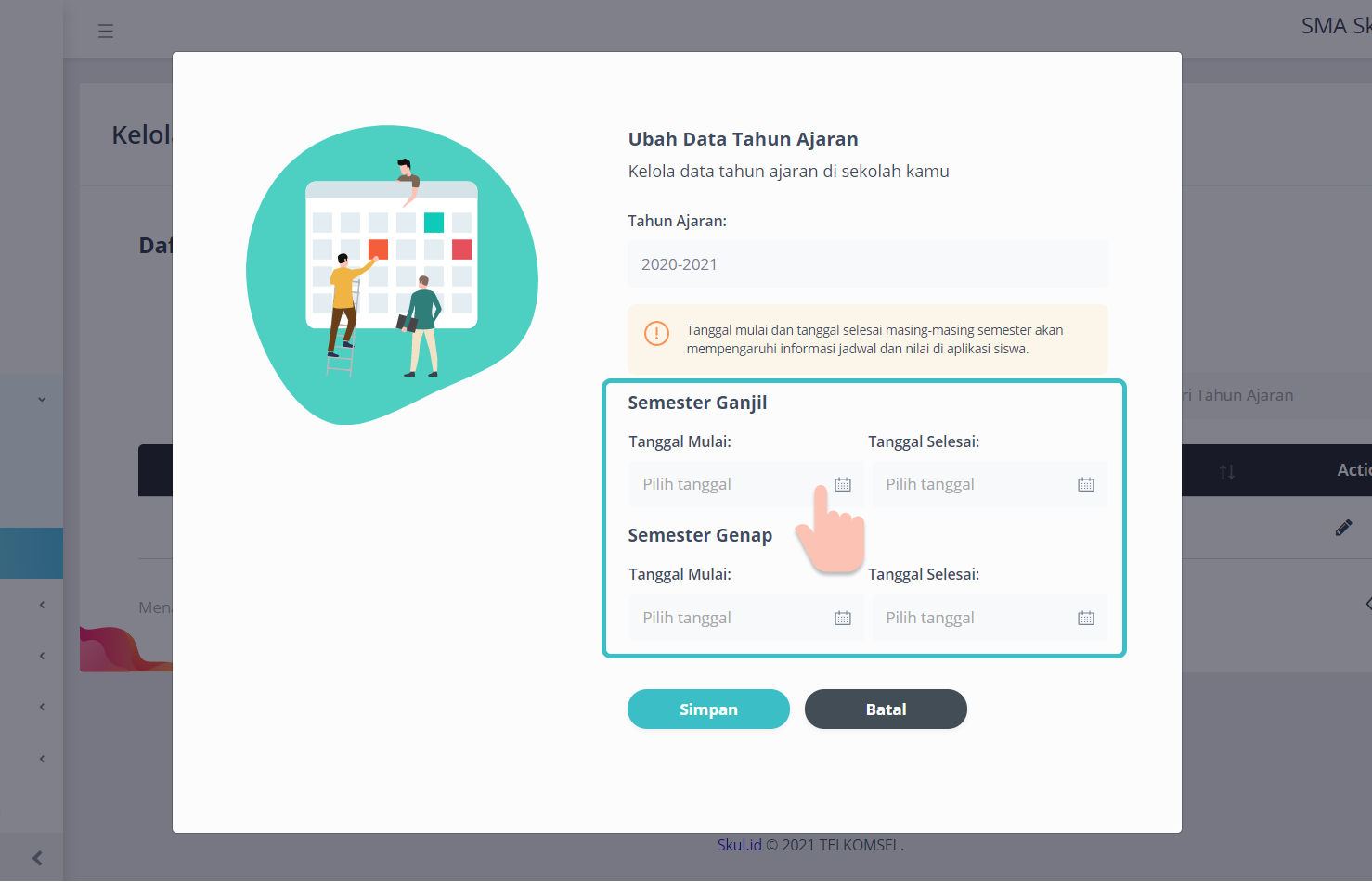 Isi tanggal mulai dan tanggal selesai untuk Semester Ganjil dan tanggal mulai dan tanggal selesai untuk Semester Genap.