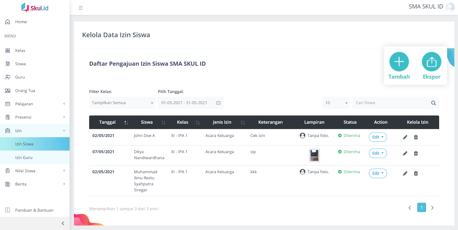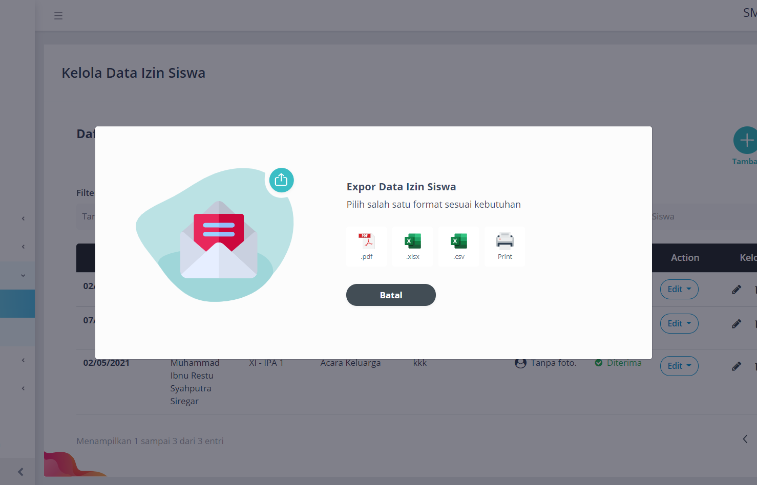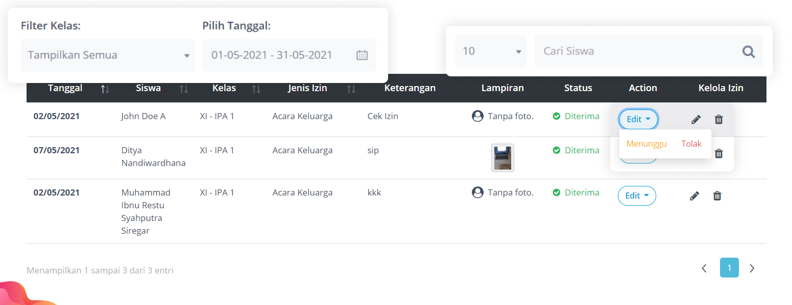 Anda dapat mengkonfirmasi izin siswa yang masih pending. Klik button Edit lalu pilih Terima atau Tolak.