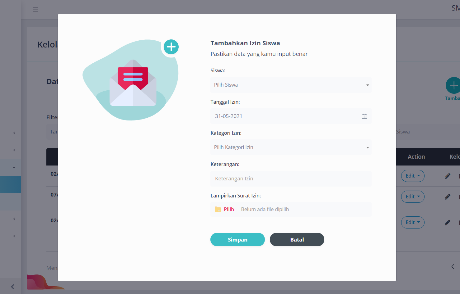 Anda dapat menambah izin untuk siswa secara manual, mengubah data izin, dan menghapus data izin yang tidak valid.