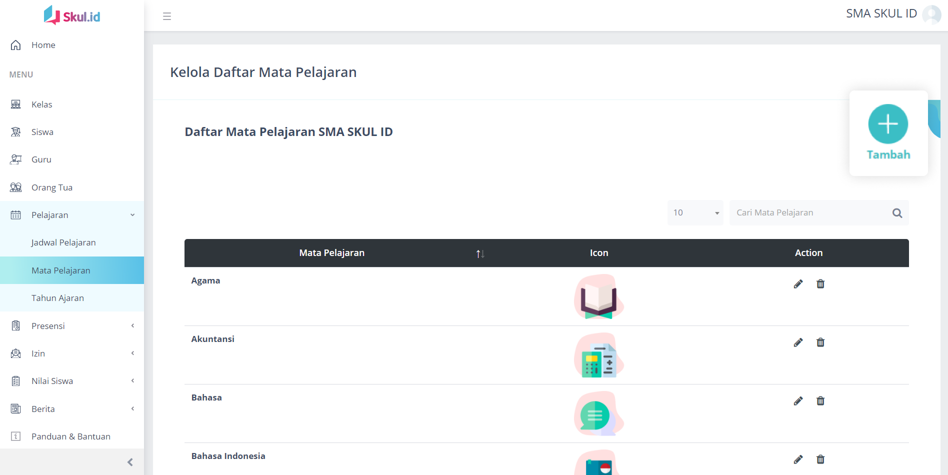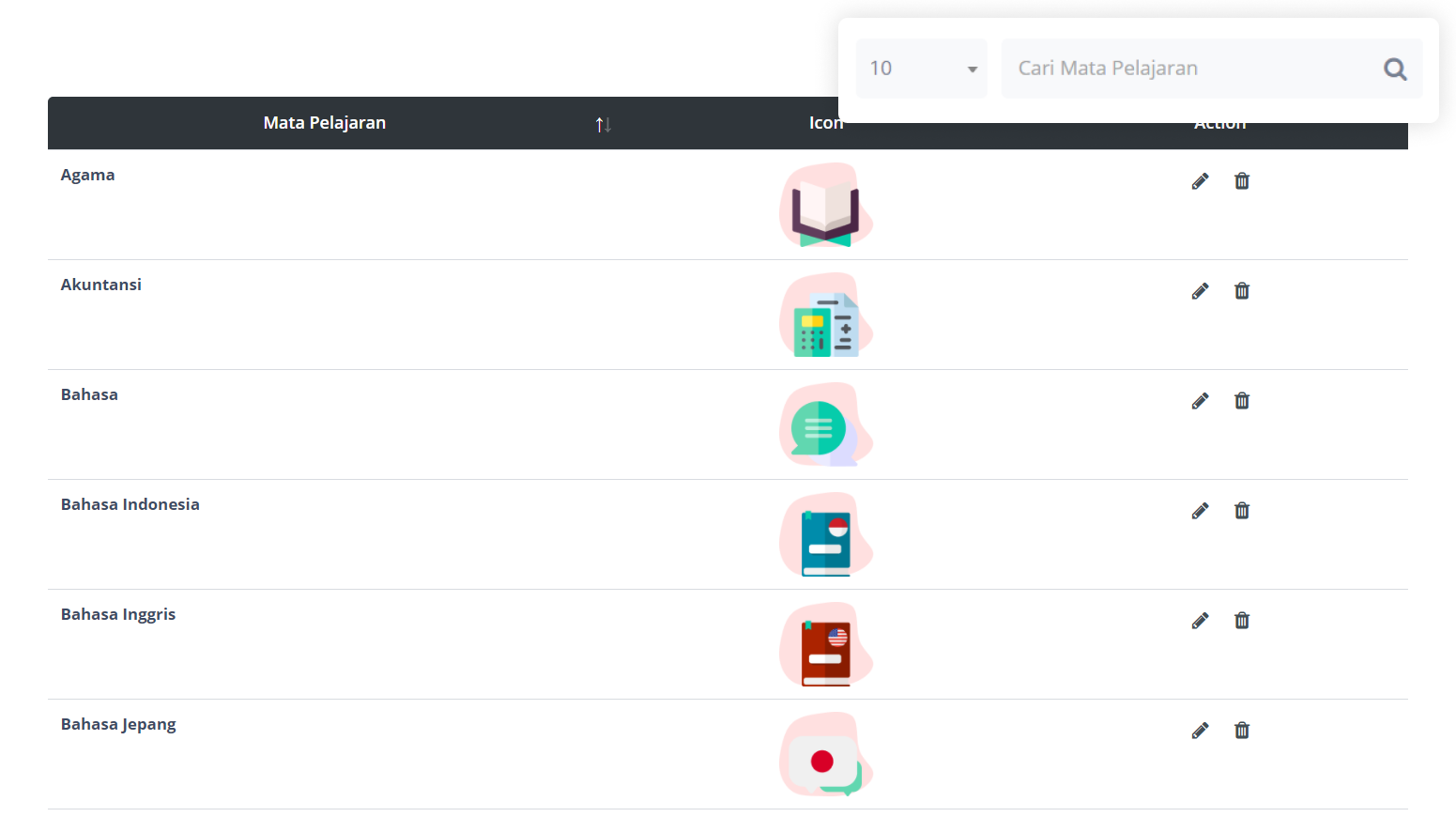 Data mata pelajaran terdiri dari informasi nama mata pelajaran dan icon. Pada saat pertama kali mendaftar, terdapat list mata pelajaran default yang sudah disediakan. Anda dapat menambah, mengubah, atau menghapus mata pelajaran yang sudah ada dengan klik icon pada kolom Action. Anda juga dapat mencari mata pelajaran dengan mengetik kata kunci pada kolom pencarian.