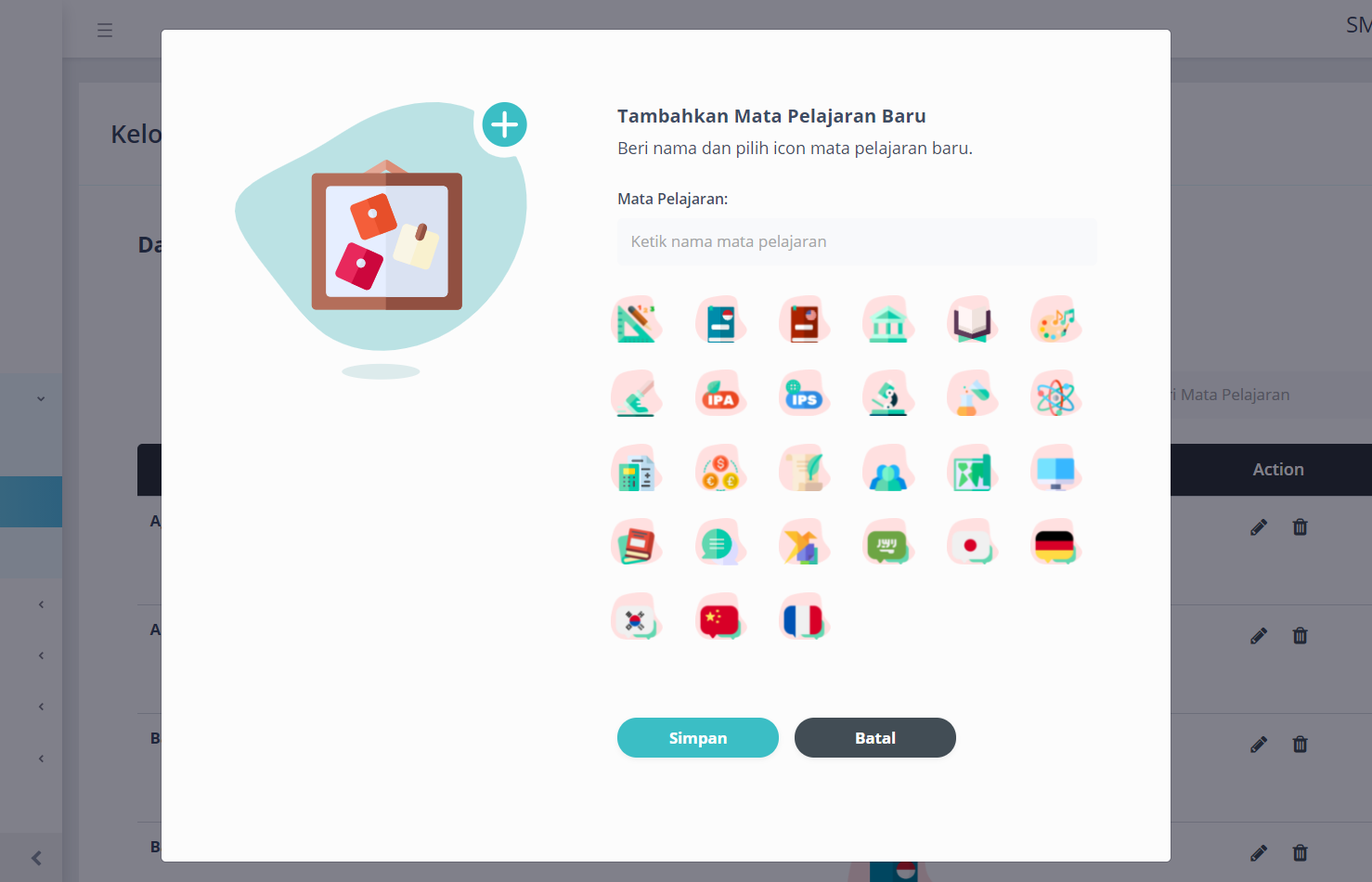 Untuk menambah mata pelajaran baru, klik button Tambah pada kanan atas. Informasi yang harus diisi diantaranya nama mata pelajaran dan icon.