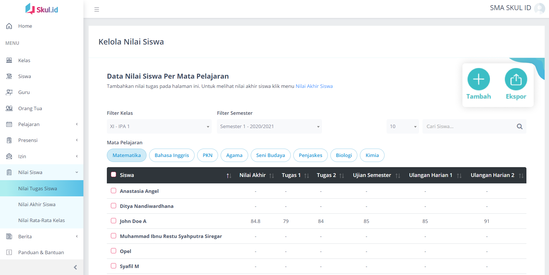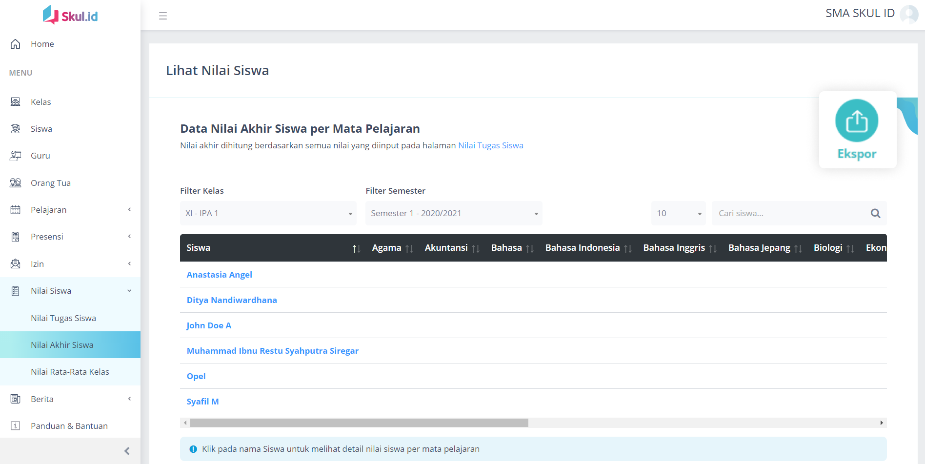 Selanjutnya menu Nilai Akhir Siswa. Pada menu ini, Anda dapat melihat akumulasi nilai tiap siswa untuk tiap mata pelajaran.