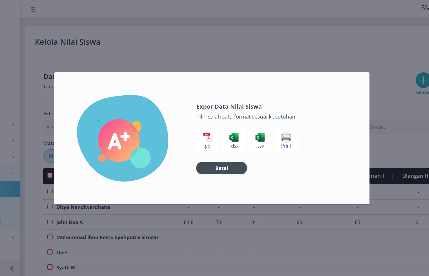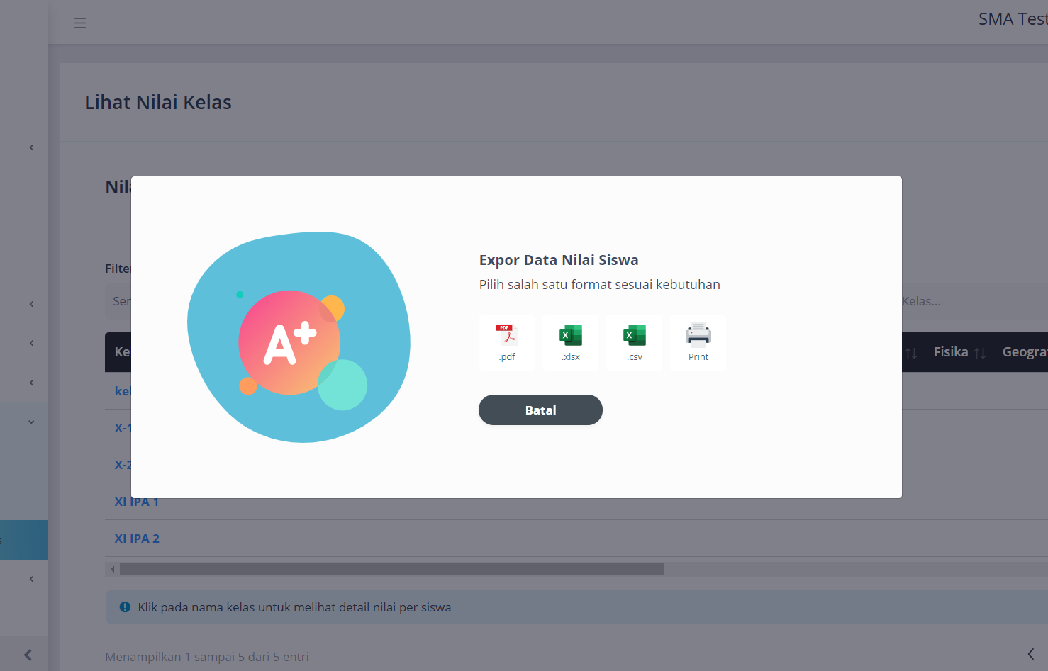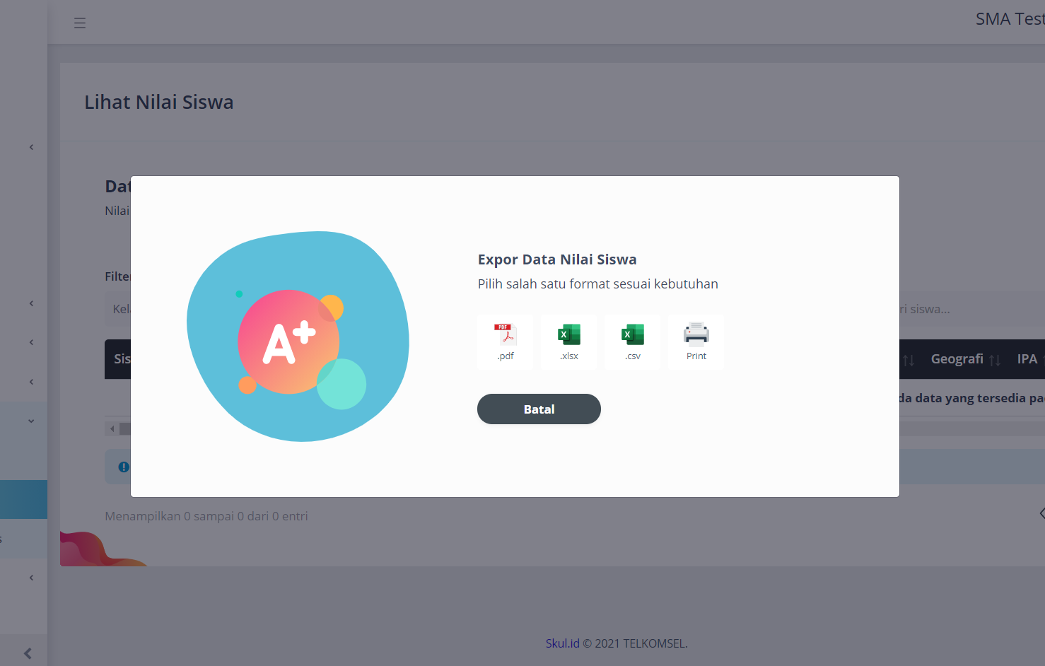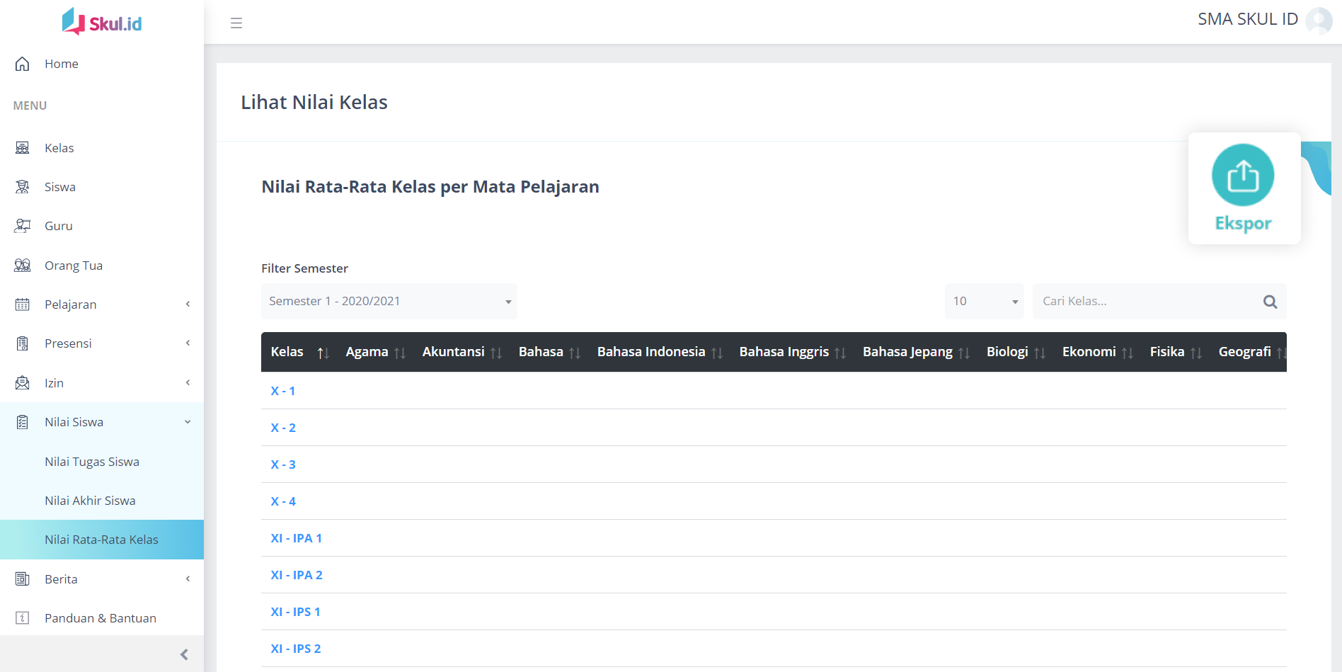 Anda juga dapat menyimpan data nilai dalam bentuk file yang diinginkan dengan cara Ekspor. Klik button Ekspor pada kanan atas, lalu pilih tipe file yang diinginkan.