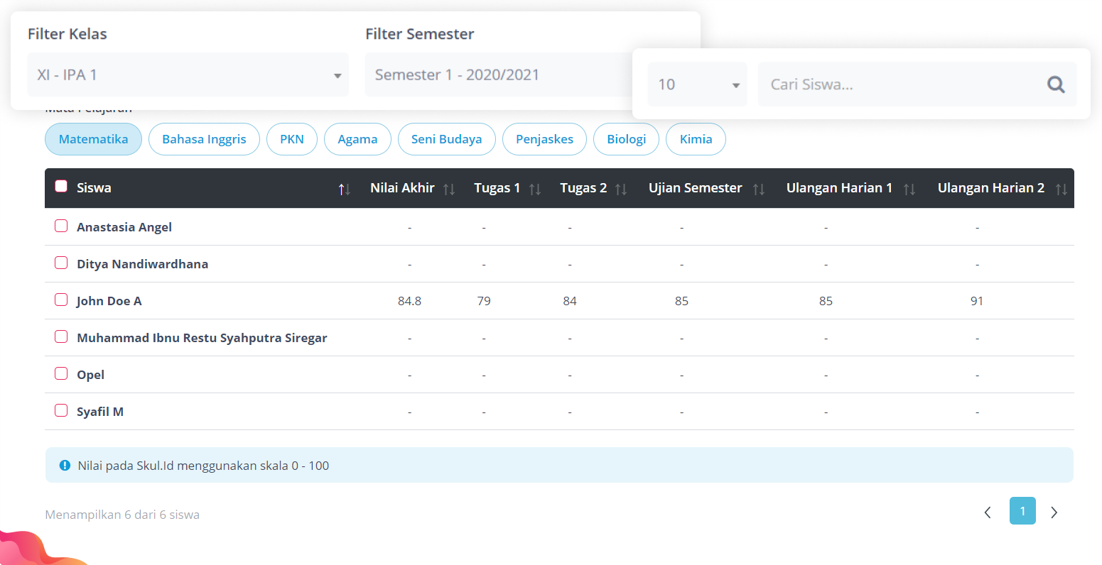 Pada tabel nilai, Anda dapat melihat daftar nilai akhir siswa per mata pelajaran. Anda dapat memfilter berdasarkan kelas dan semester. Anda juga dapat mencari nama siswa pada kolom pencarian.
