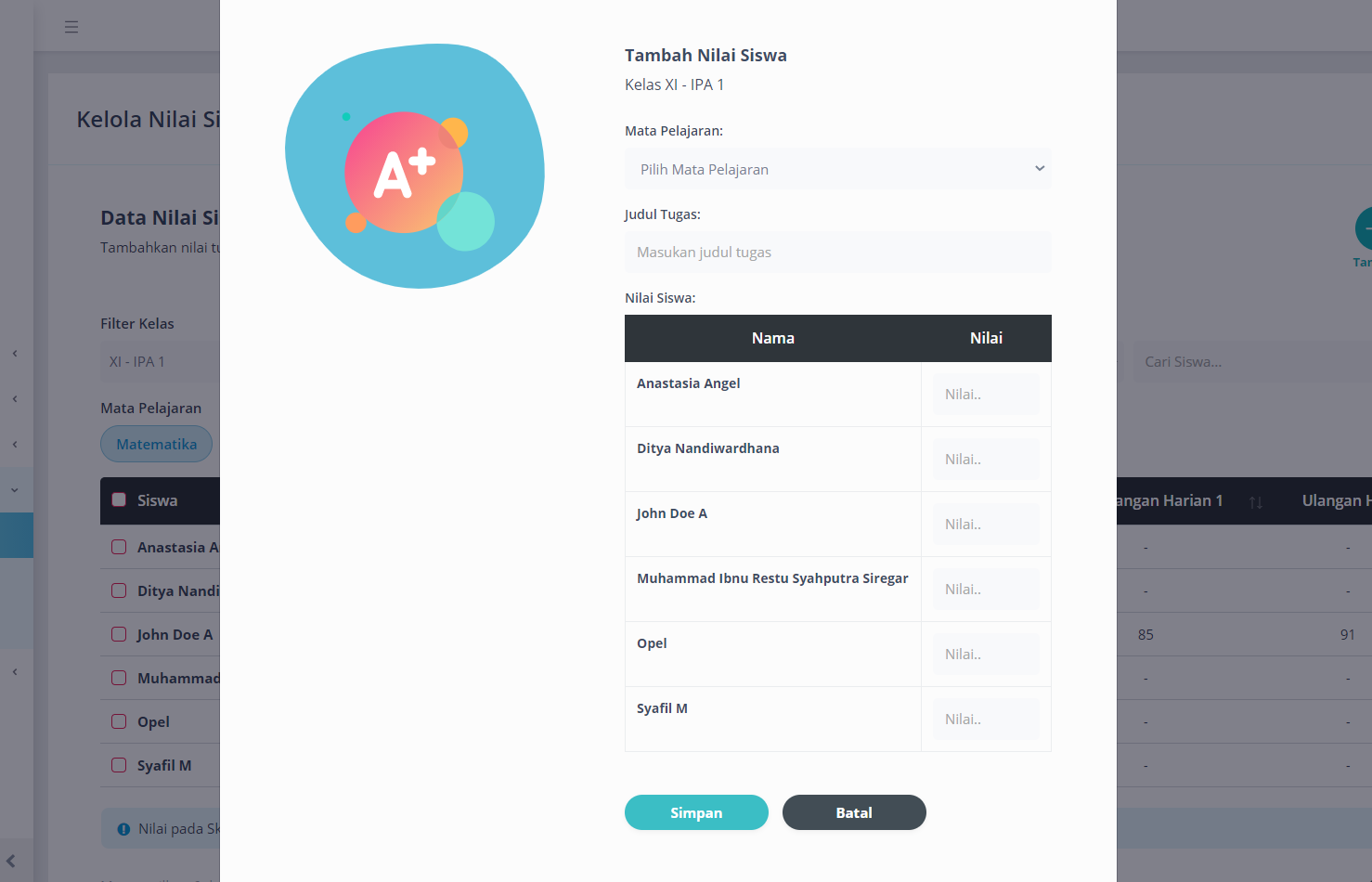 Untuk menambahkan nilai siswa, Anda dapat klik button Tambah pada kanan atas. Lalu akan tampil formulir Tambah Nilai Siswa. Anda diminta untuk mengisi mata pelajaran, judul tugas, dan nilai untuk semua siswa.