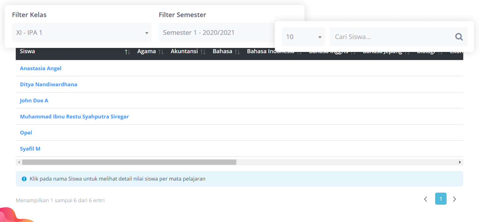 Pada tabel nilai, Anda dapat melihat daftar nilai siswa per kategori. Anda dapat memfilter berdasarkan kelas dan semester. Anda juga dapat mencari nama siswa pada kolom pencarian.