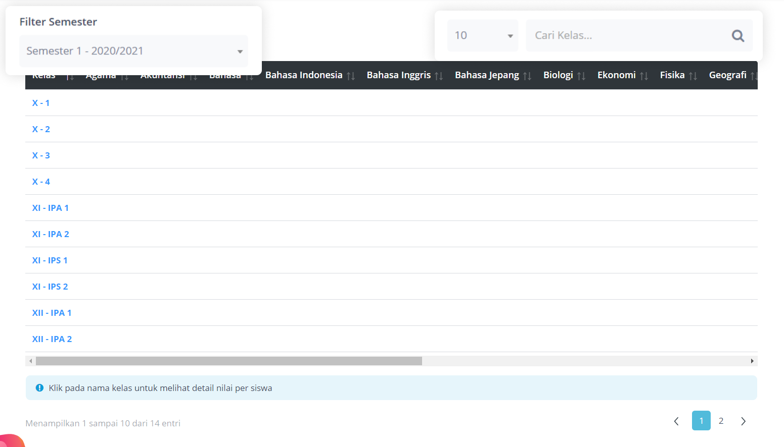 Pada tabel nilai, Anda dapat melihat daftar nilai rata-rata kelas untuk tiap mata pelajaran. Anda dapat memfilter berdasarkan semester. Anda juga dapat mencari nama kelas pada kolom pencarian.