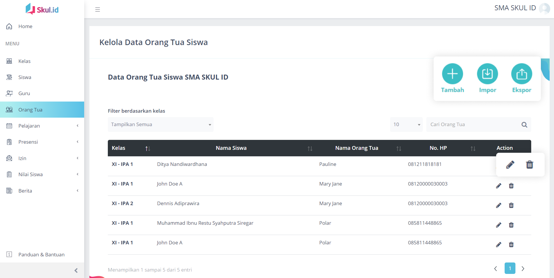 Untuk mengelola data orang tua, Anda dapat klik Orang Tua pada menu pilihan di sebelah kiri layar Anda.