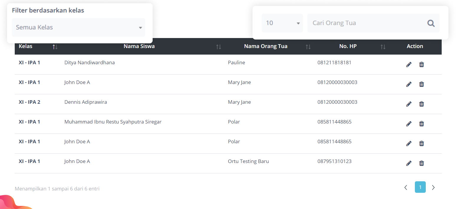 Tabel orang tua terdiri dari informasi Kelas Siswa, Nama Siswa, Nama Orang Tua, dan No. Handphone. Anda dapat mencari orang tua menggunakan kata kunci atau memfilter berdasarkan kelas.