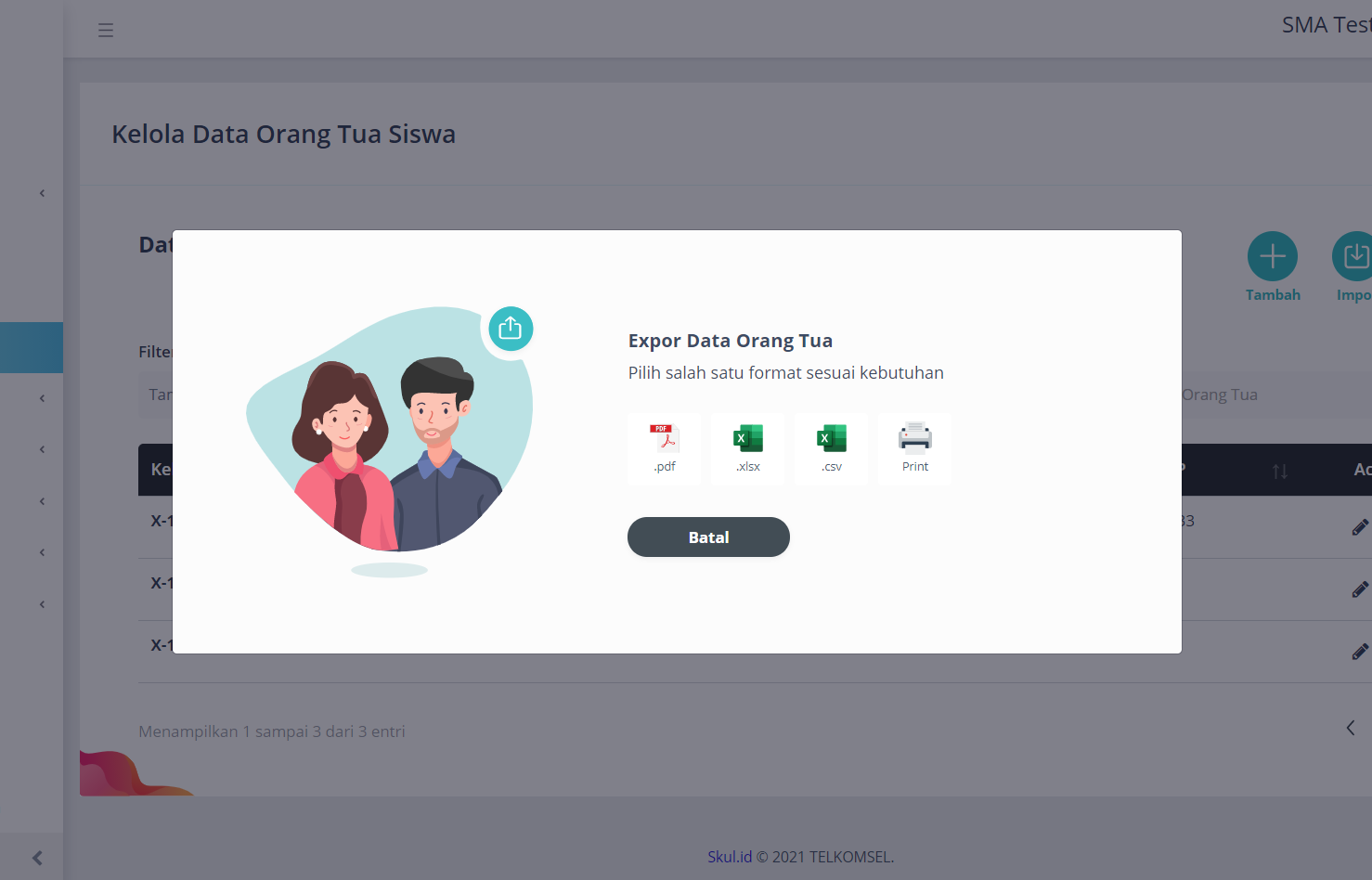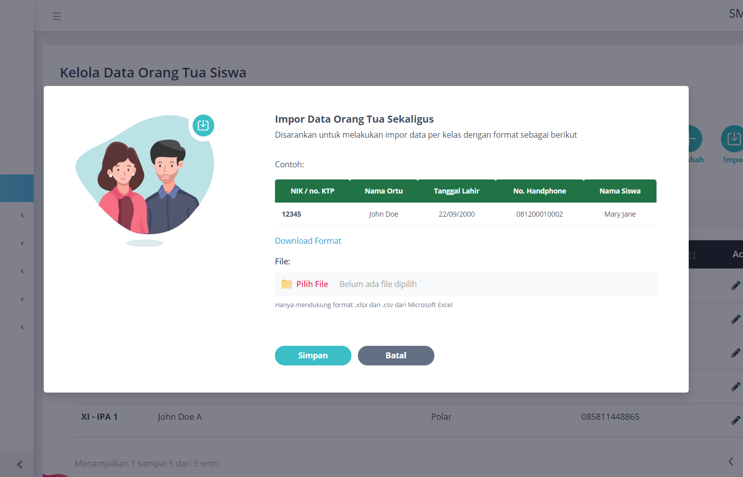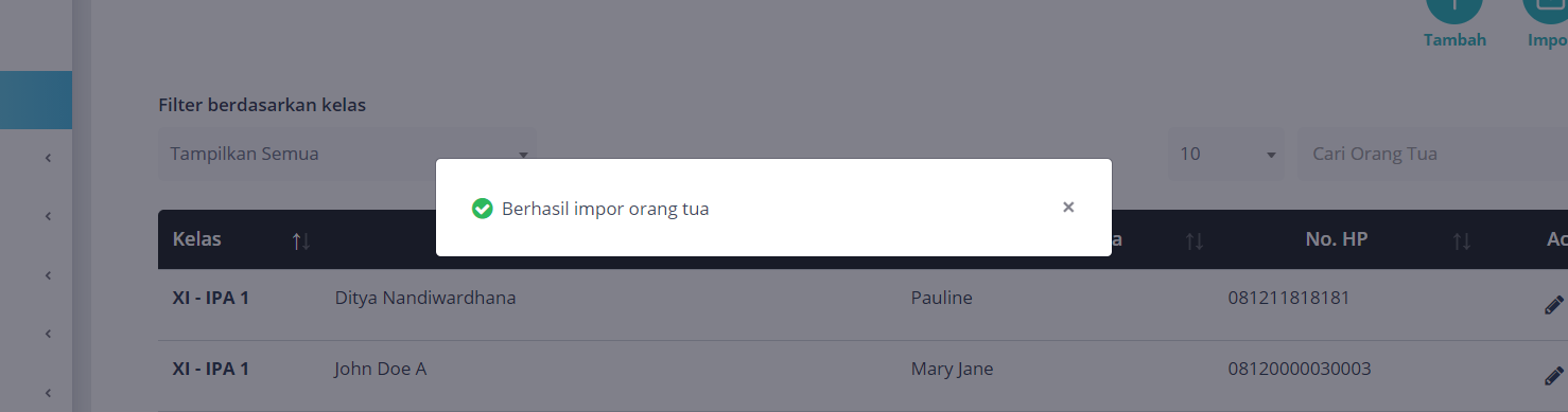 Untuk menambahkan data orang tua sekaligus, Anda dapat menggunakan fitur impor. Klik button Impor pada kanan atas. Anda dapat melihat pada layar atau mengunduh contoh format excel.