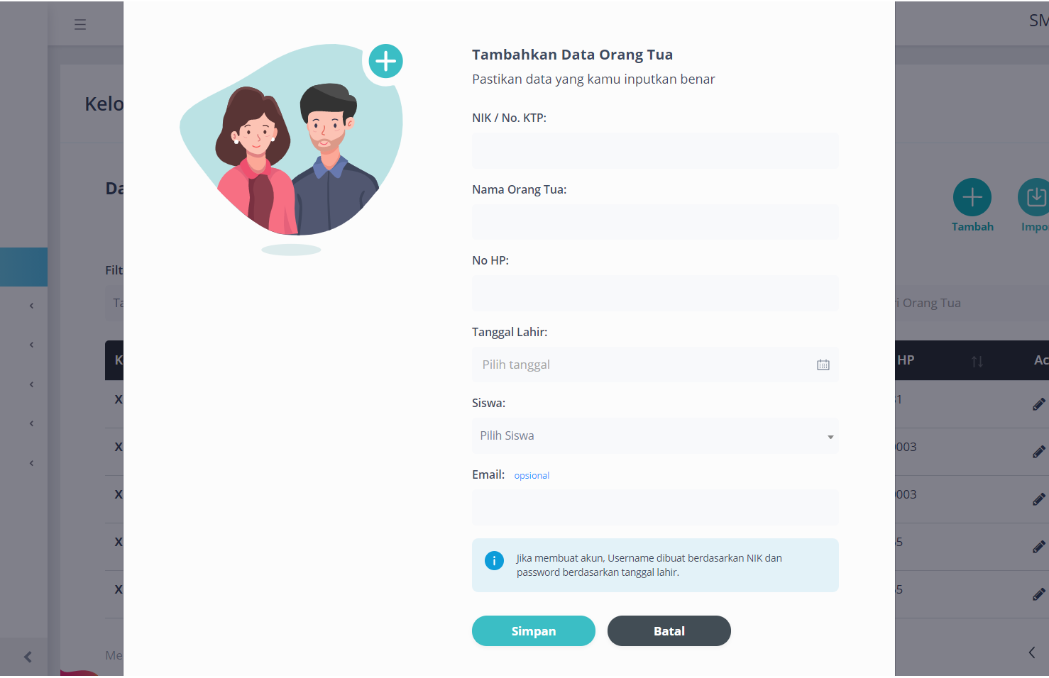 Anda dapat menambah orang tua secara satu per satu melalui form Tambah Orang Tua. Klik icon Tambah pada kanan atas. Informasi yang harus diisi diantaranya NIK, Nama Orang Tua, No. Handphone, Tanggal Lahir, dan Nama Siswa.