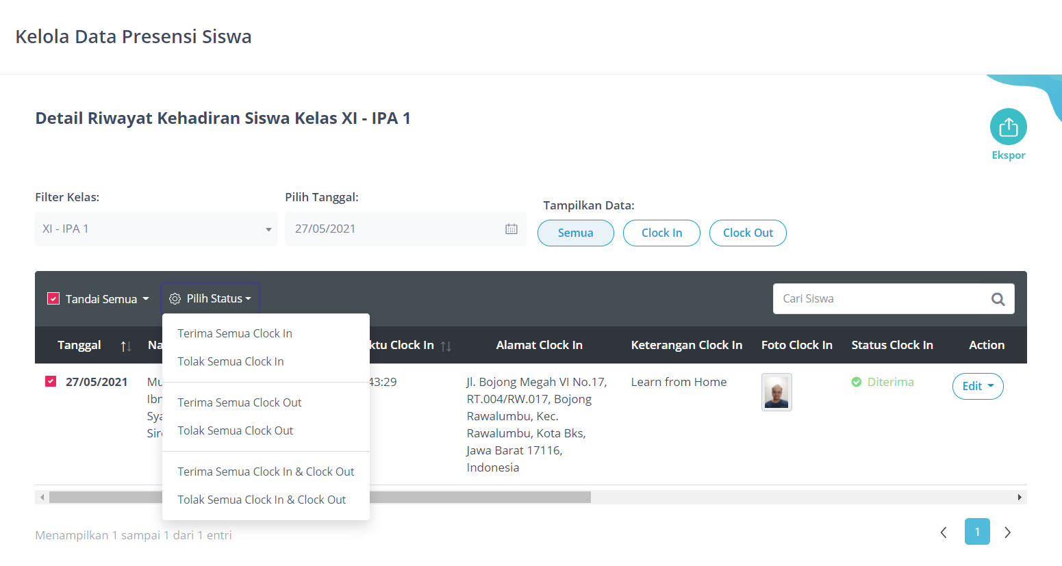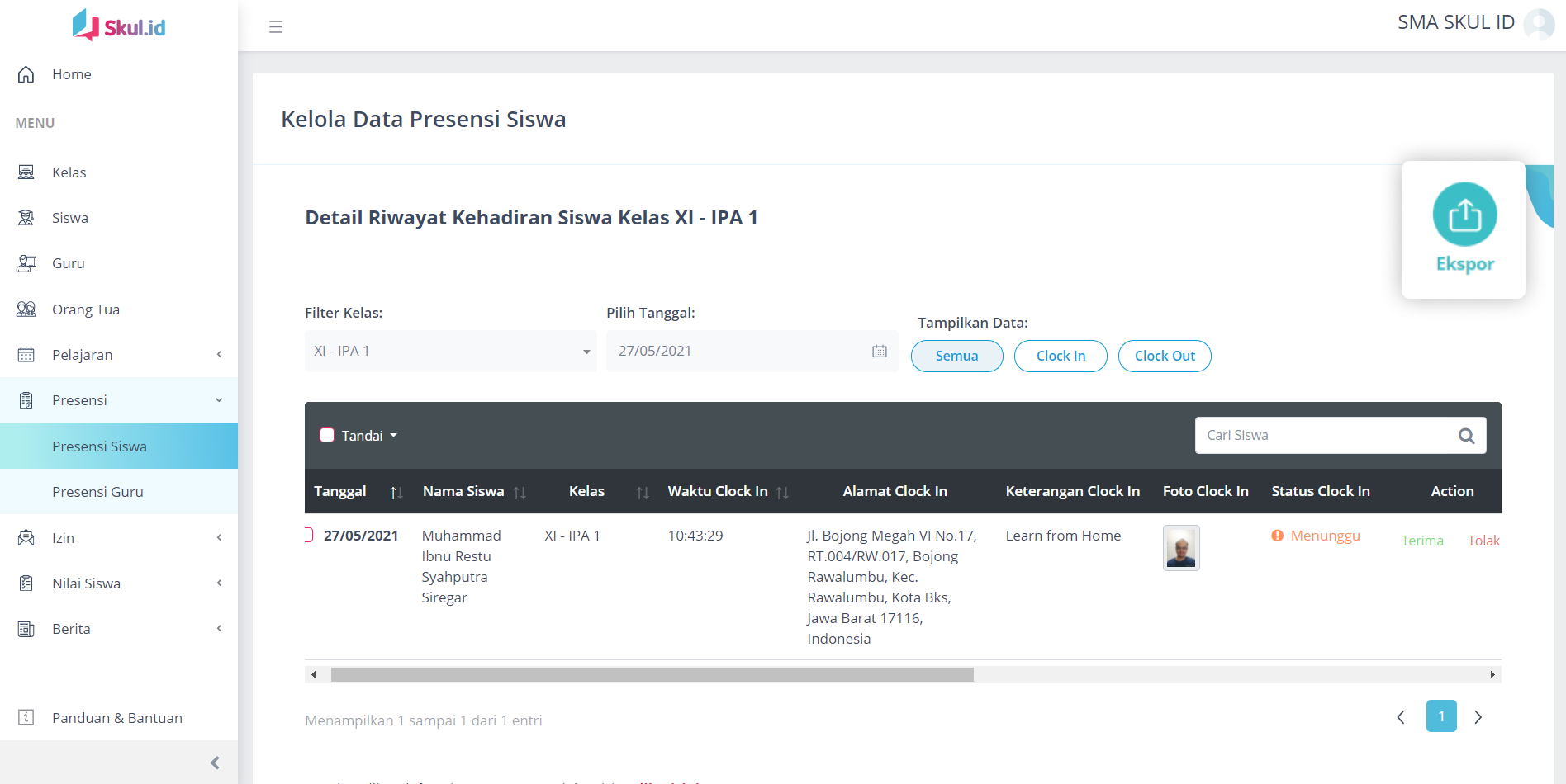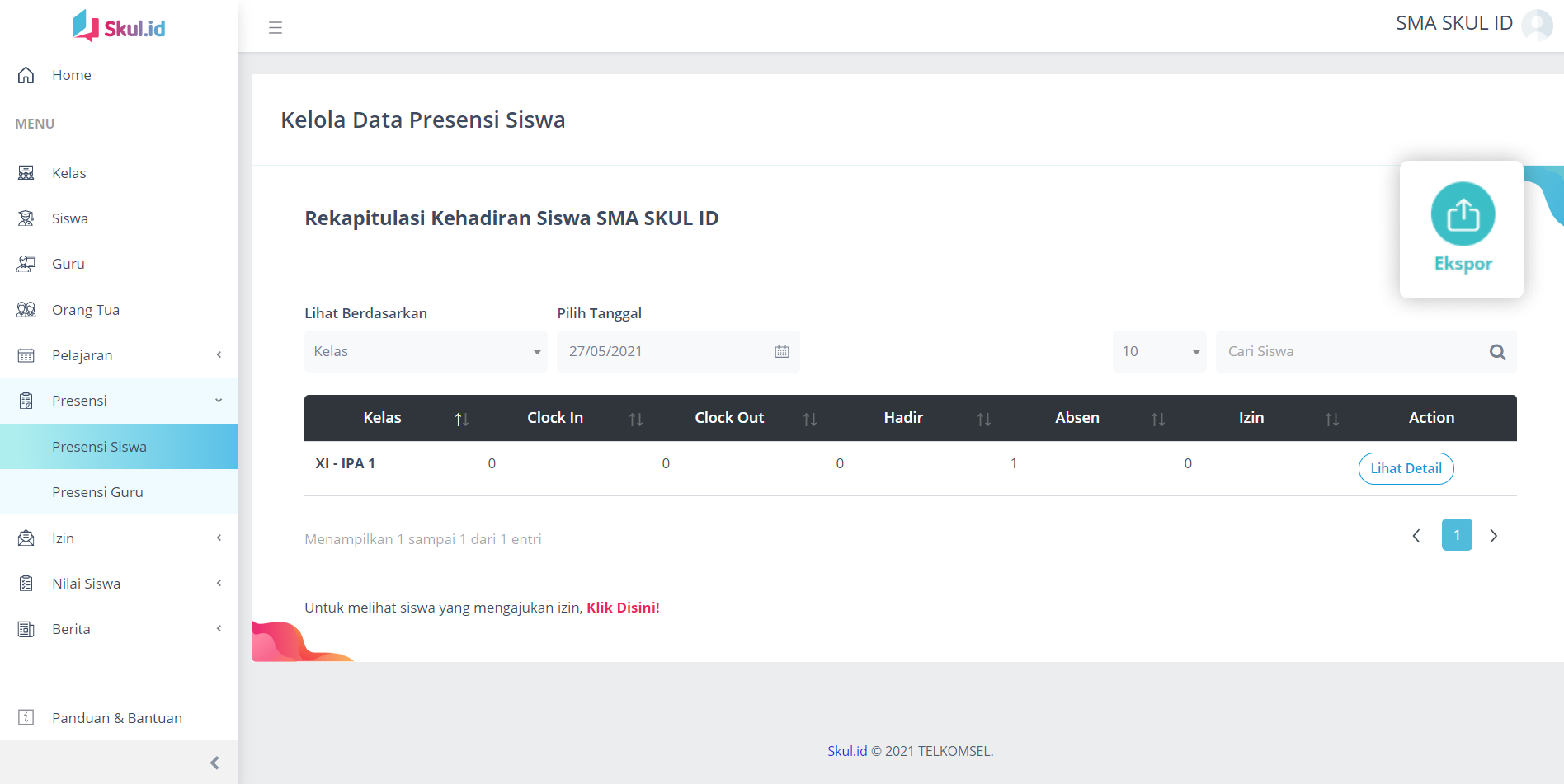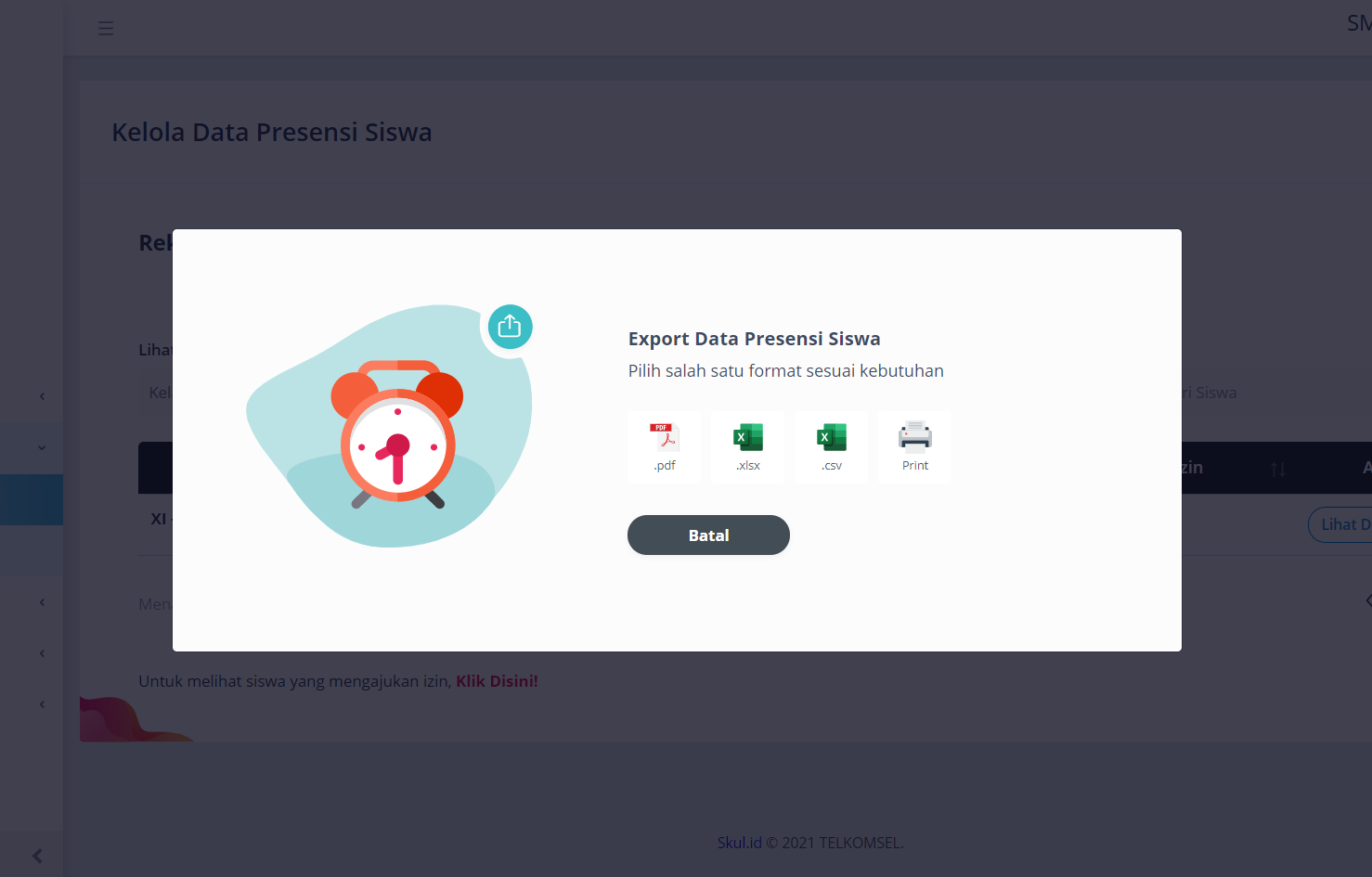 Anda dapat mengekspor rekap presensi siswa per kelas dengan mengklik button ekspor di kanan atas lalu pilih format file yang diinginkan.