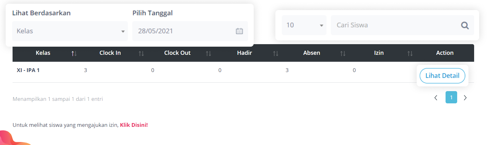 Informasi yang ditampilkan adalah jumlah siswa yang sudah clock in, clock out, total hadir, absen, dan izin dalam satu hari. Anda bisa melihat berdasarkan kelas tertentu dan mengganti tanggal lain. Anda juga bisa melihat detail per kelas dengan mengklik button Lihat Detail.