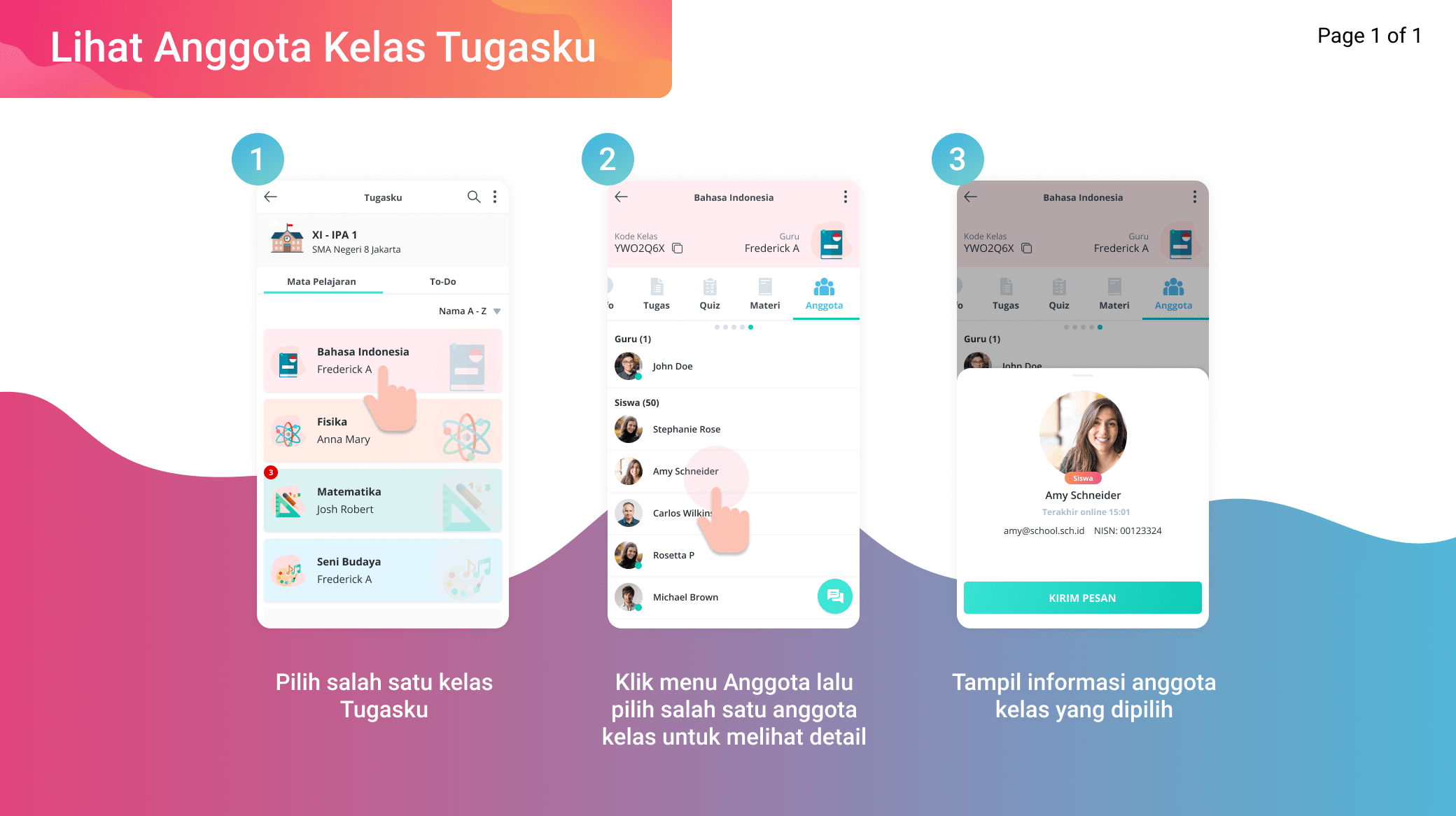 Siswa dapat melihat siapa saja siswa dan guru yang tergabung dalam kelas Tugasku. Siswa juga dapat mengirim pesan ke siswa dan guru melalui Tugasku.