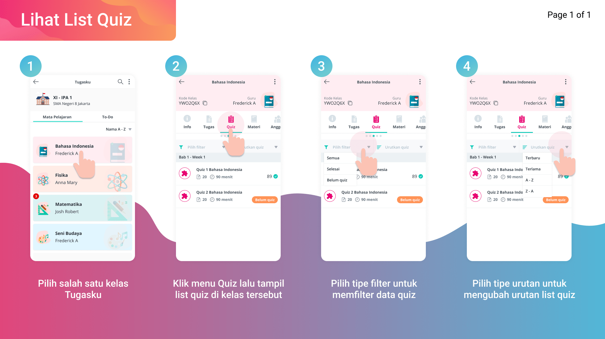 Siswa dapat melihat dan mengerjakan quiz yang sudah dibuat guru pada kelas Tugasku. Quiz pada Tugasku berupa soal pilihan ganda yang harus dikerjakan siswa dalam durasi waktu tertentu. Siswa akan langsung mengetahui nilai quiz-nya.