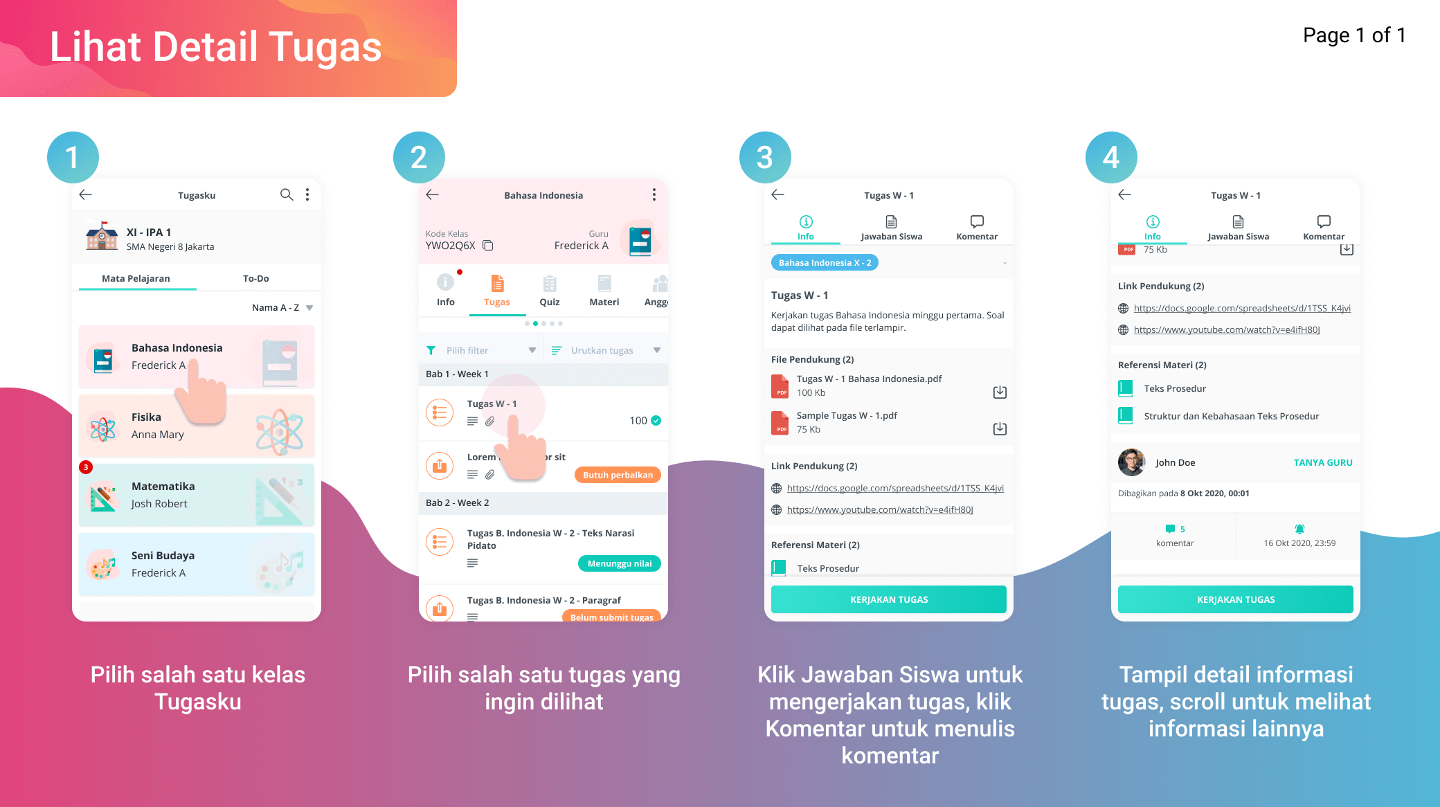 Siswa dapat melihat informasi lengkap mengenai tugas di dalam kelas Tugasku melalui halaman detail tugas. Jika siswa sudah mengerjakan tugas, maka siswa dapat melihat jawabannya melalui menu Jawaban Siswa. Selain itu, siswa juga dapat melihat komentar pada tugas tersebut.