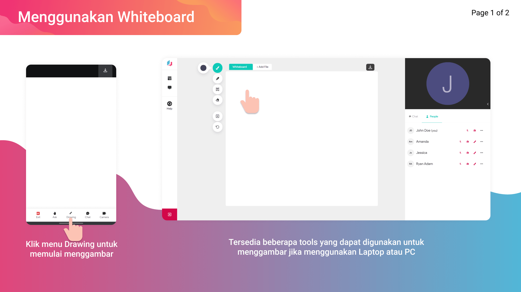 Untuk menggambar pada whiteboard, siswa dapat mengklik icon Whiteboard di sebelah kiri jika menggunakan laptop atau PC, atau klik icon Whiteboard di bagian bawah jika menggunakan handphone.